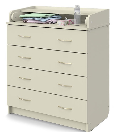 Пеленальный комод с четырьмя вместительными ящиками шириной 80 см и откидной пеленальной доской, верхняя крышка которой с помощью поворотного механизма легко превращается в удобный пеленальный столик, увеличивая полезную поверхность на 22,7 см.