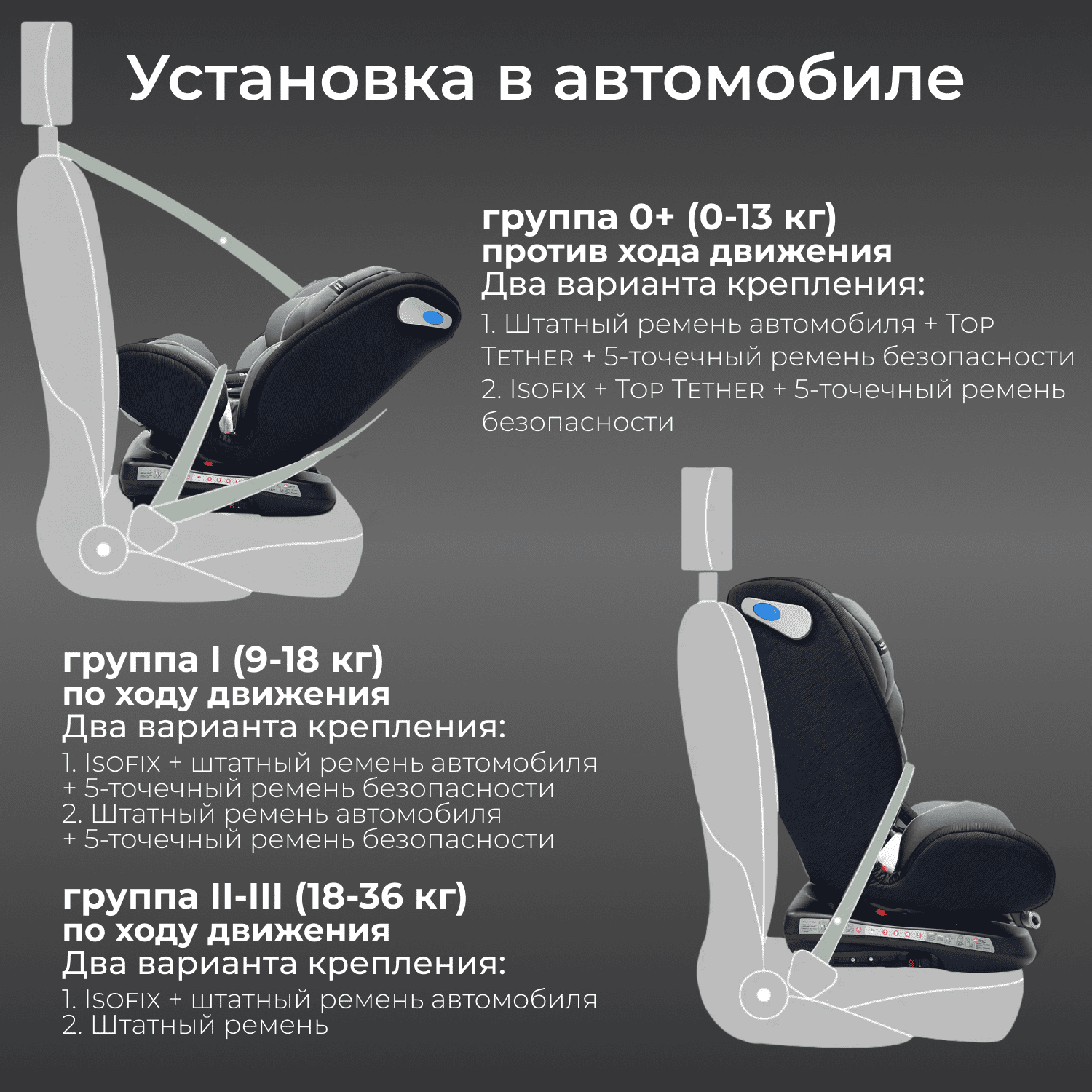 Установка против хода движения для группы 0+ (0–13 кг), по ходу — для групп I–III (9–36 кг).