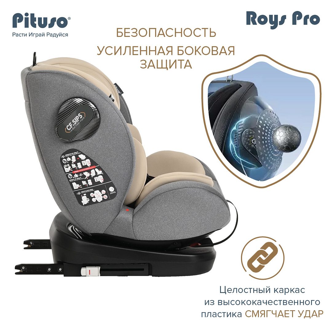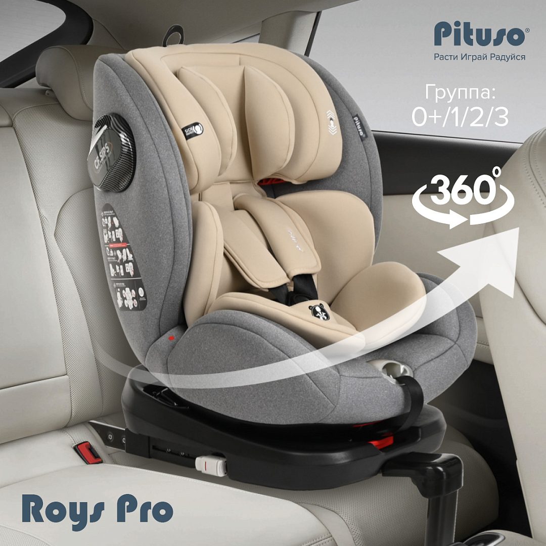 Автокресло Pituso Roys Pro – это универсальное поворотное кресло 0–36 кг с вращением на 360°, рассчитанное на детей от рождения до 12 лет и соответствующее стандарту безопасности ECE R44/04.