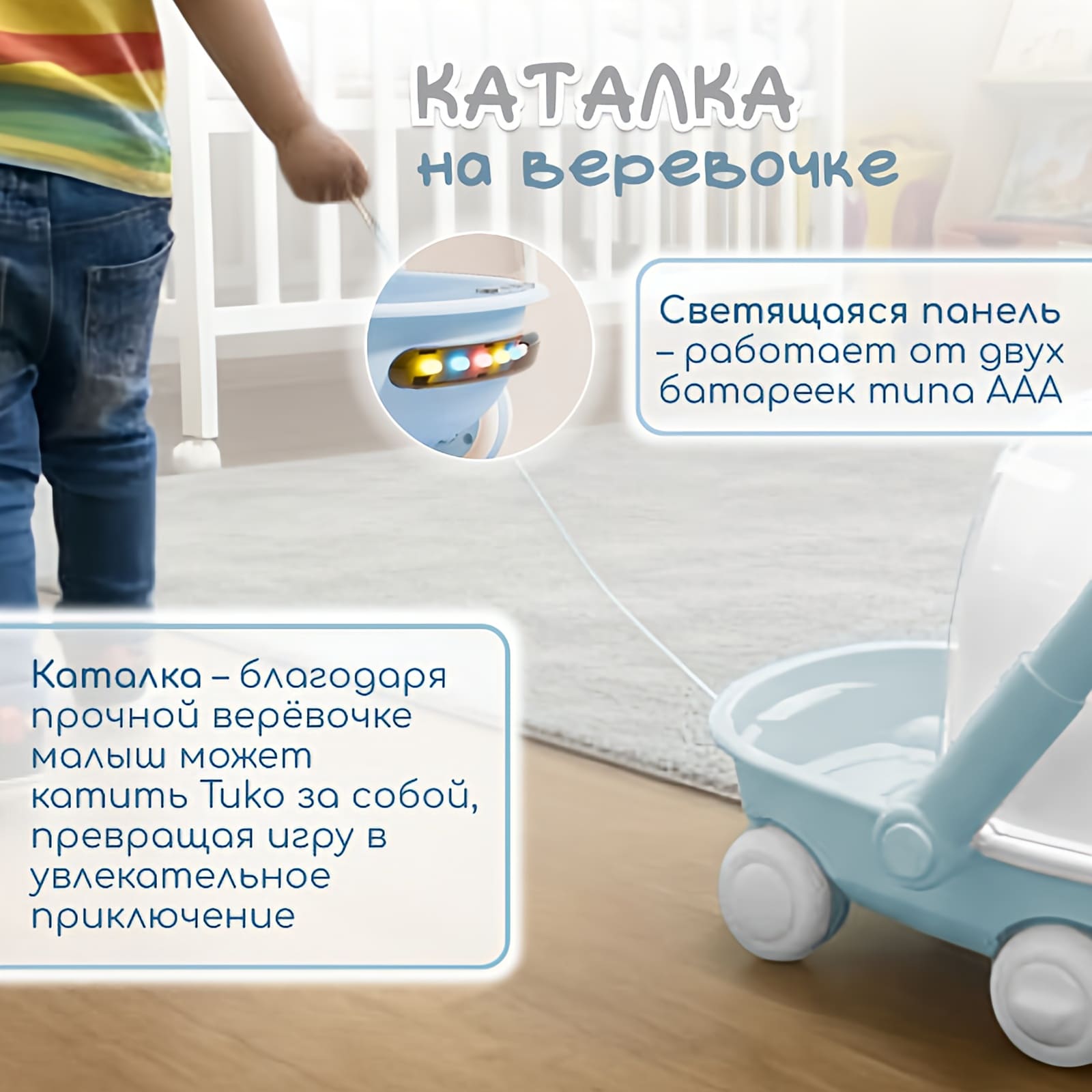 • Каталка – с помощью прочной верёвочки ребёнок может катить Tuko за собой, превращая обычную прогулку или игру дома в увлекательное приключение.