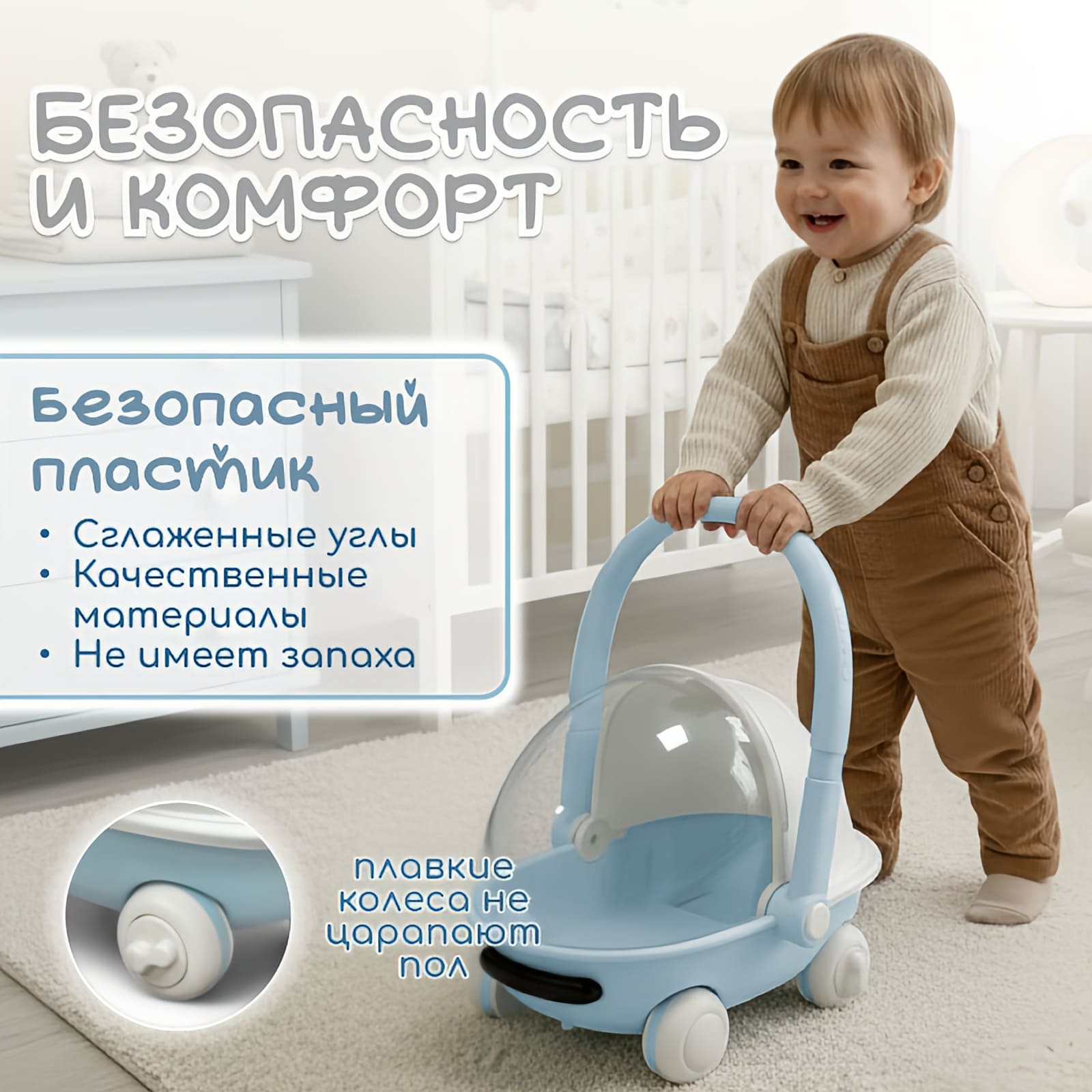 • Дизайн в форме колясочки: стильный, «домашний» внешний вид, который понравится и детям, и родителям, легко вписывается в интерьер детской комнаты.