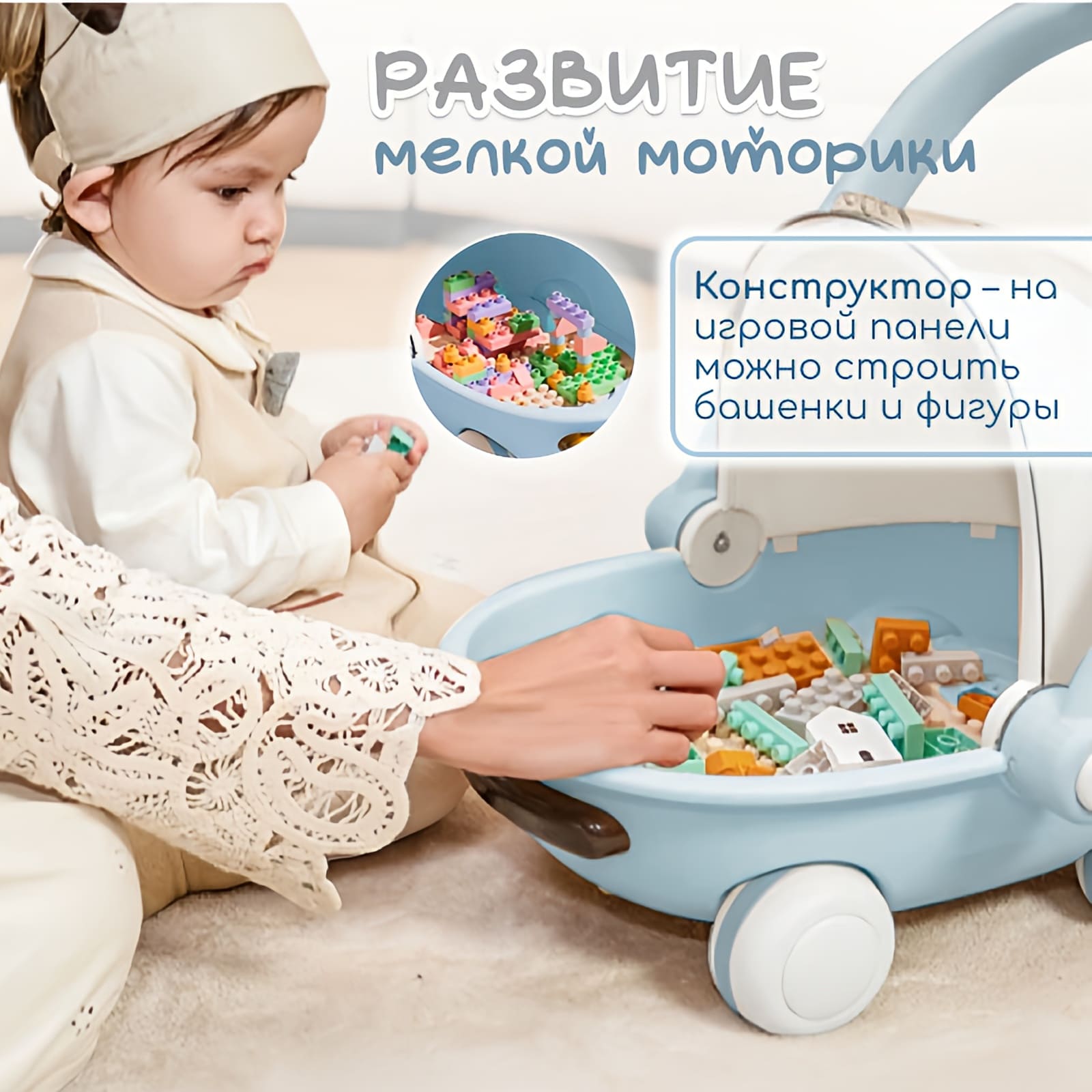 • Конструктор – на игровой панели малыш может строить башенки и фигурки, развивая мелкую моторику, усидчивость и фантазию.