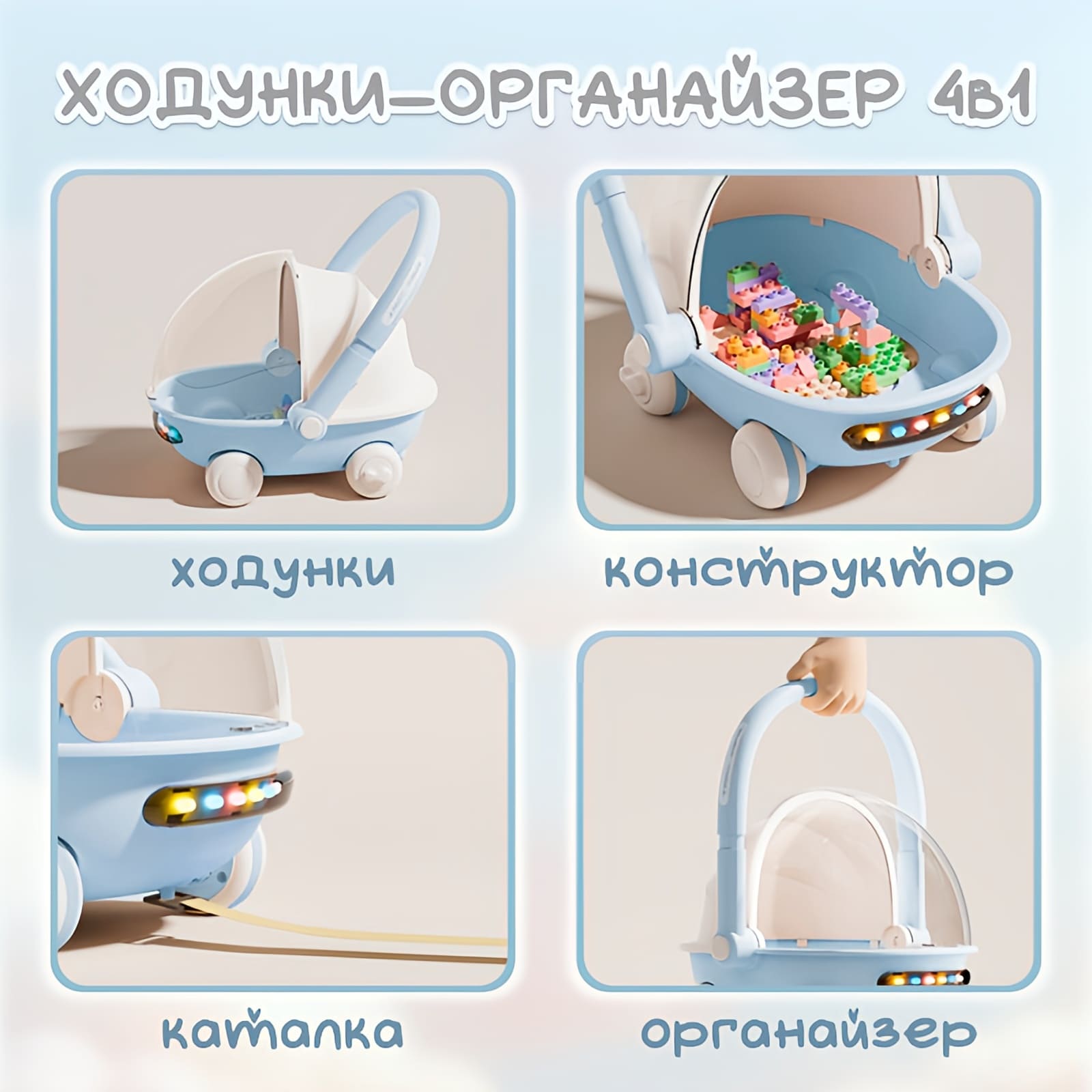 Детская каталка‑ходунки BubaGO Tuko — многофункциональная игрушка 4 в 1 (ходунки, каталка, органайзер и конструктор), которая помогает малышу делать первые шаги, развивать моторику, воображение, слух и зрение в игровой форме.