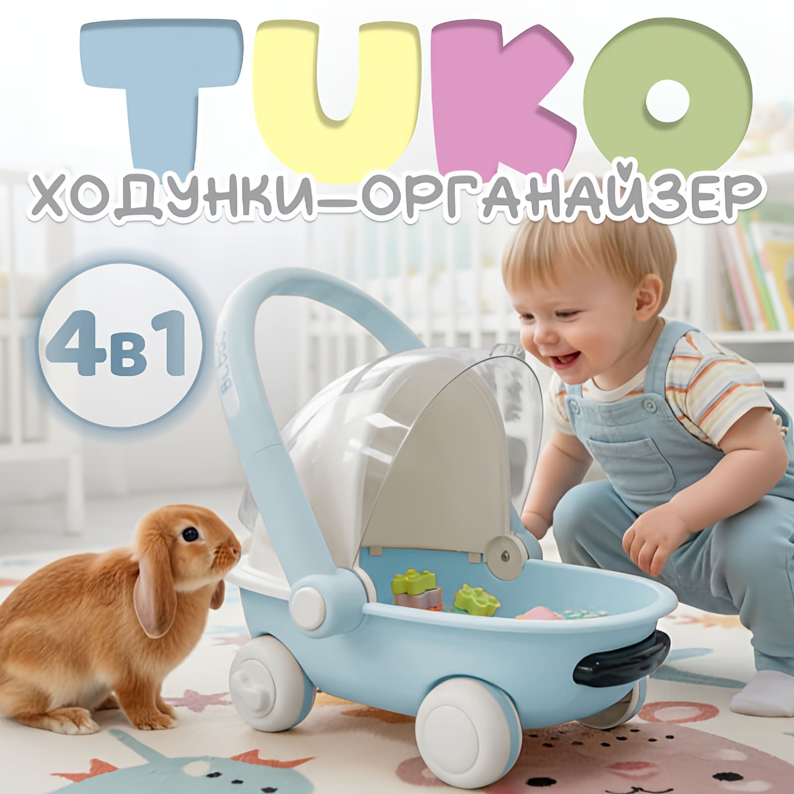 BubaGO Tuko сочетает в себе ходунки, каталку, игровой конструктор и органайзер для игрушек в одном компактном устройстве. Игрушка подходит для первых шагов, развития моторики и воображения, а также удобного хранения мелочей.