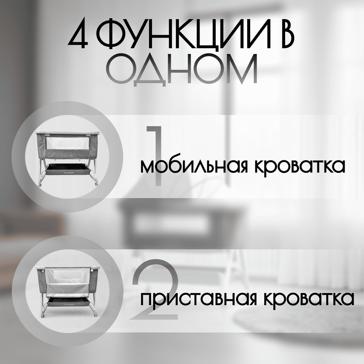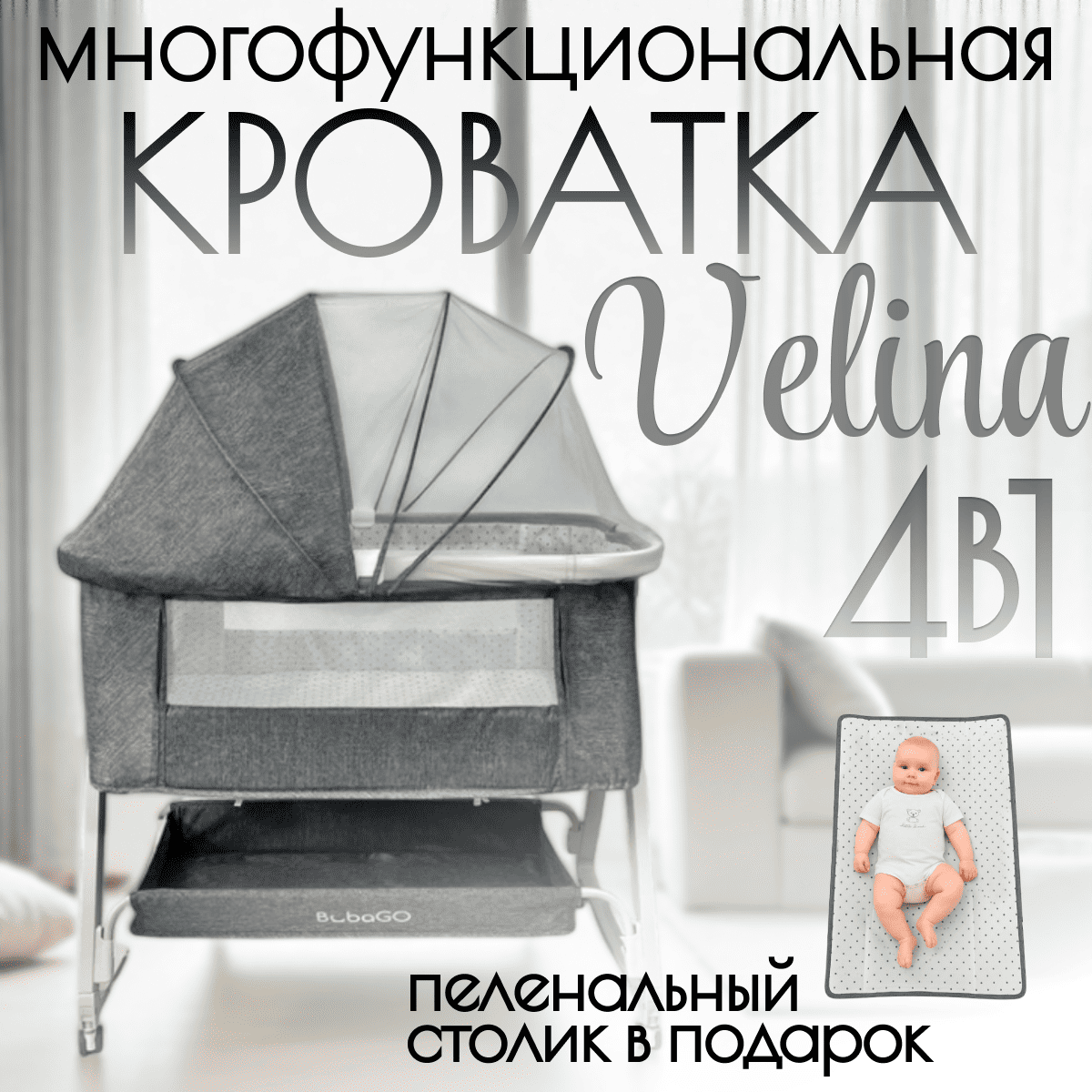 Приставная кроватка BubaGO Velina 5 в 1 — многофункциональная кроватка‑трансформер для сна, отдыха, ухода и игр с первых дней жизни малыша.