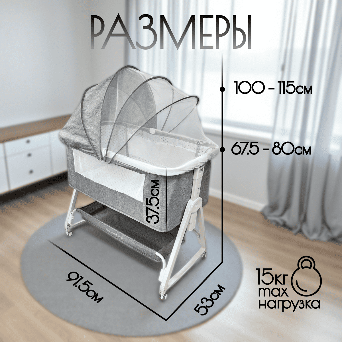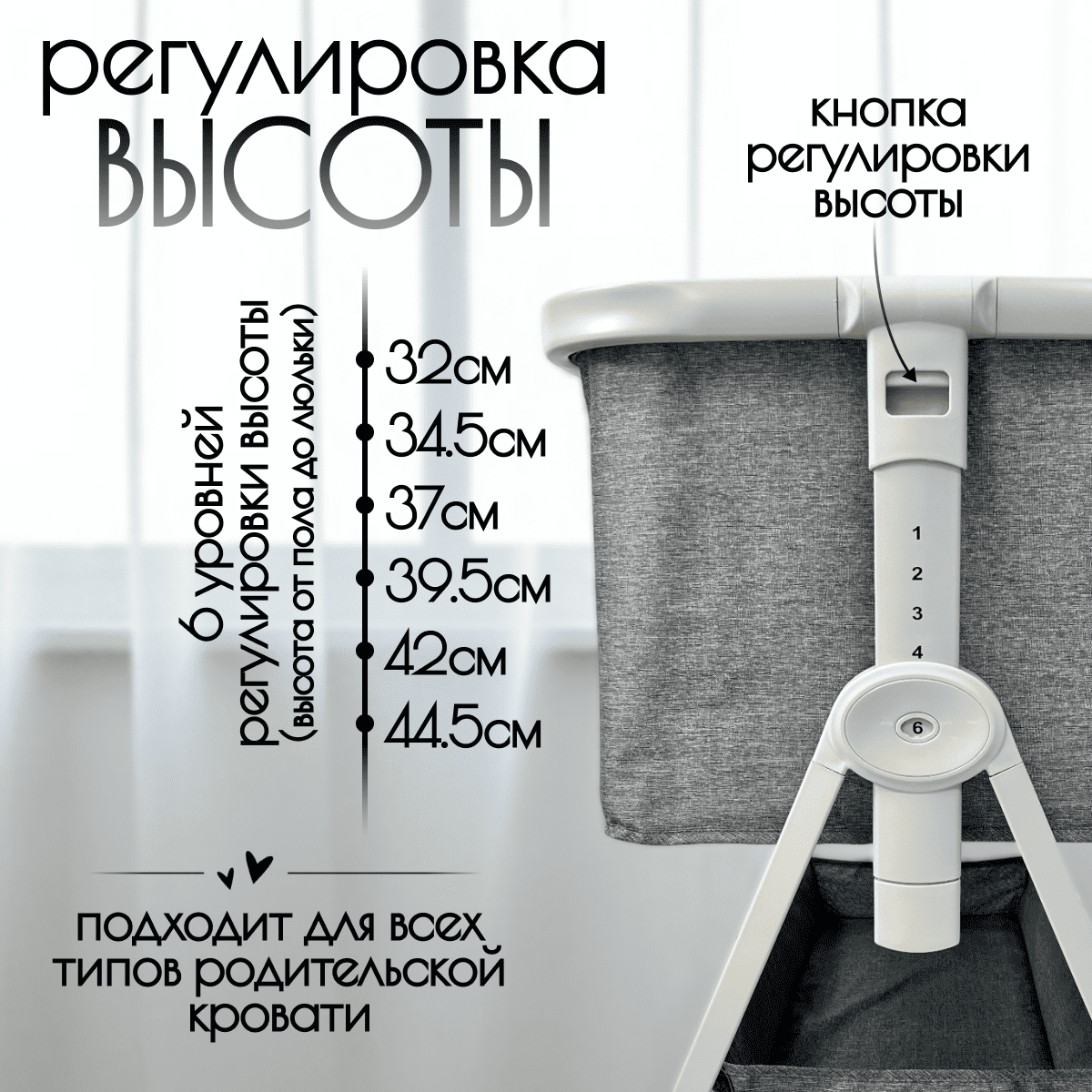 Высота от пола до люльки: 32–44,5 см (6 уровней).
