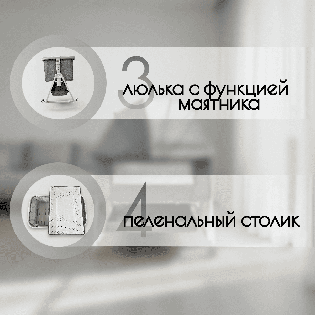 5 режимов: мобильная кроватка, приставная кровать для ночного кормления, люлька с маятником, манеж, пеленальный столик.