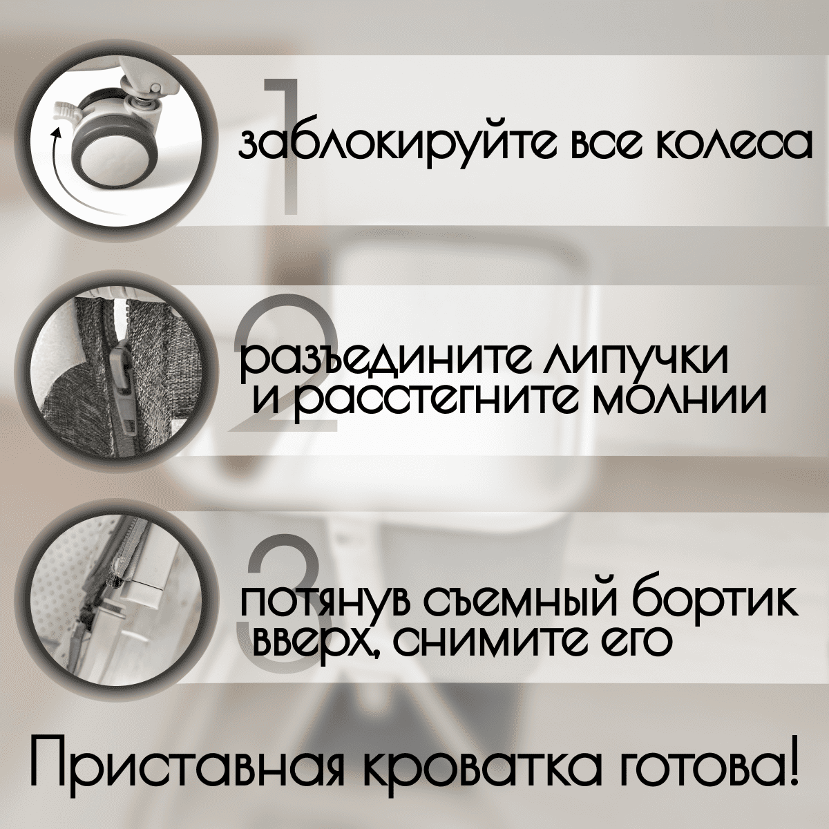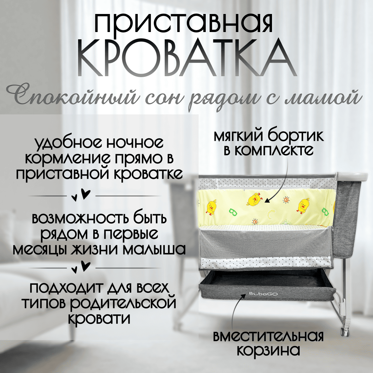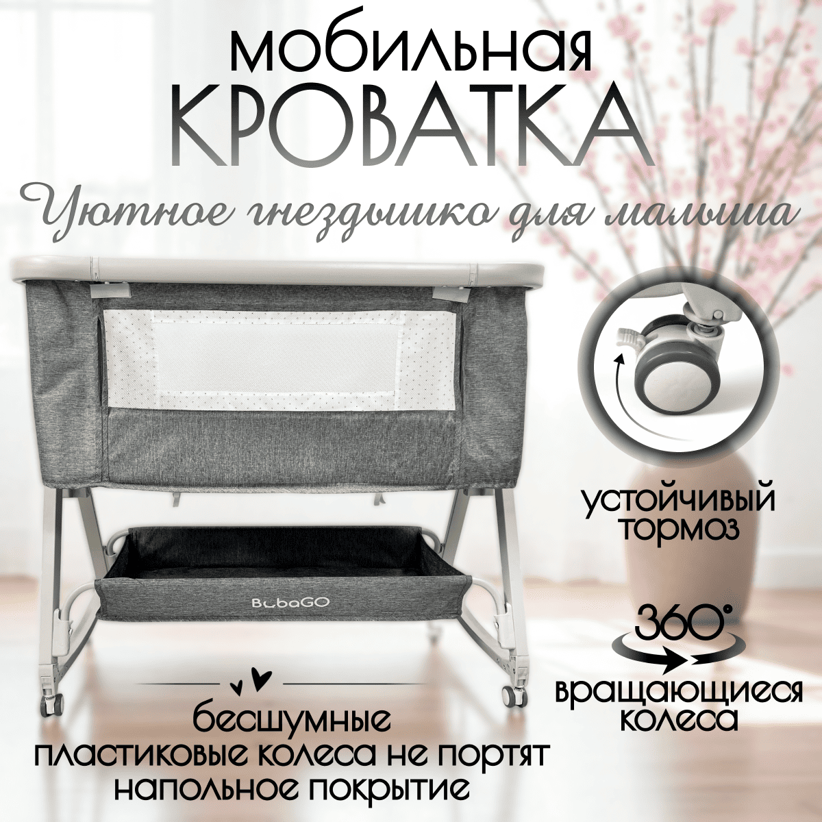 Безопасность: высокие бортики, устойчивый каркас, колёса с тормозами и фиксацией, ремень крепления к взрослой кровати.