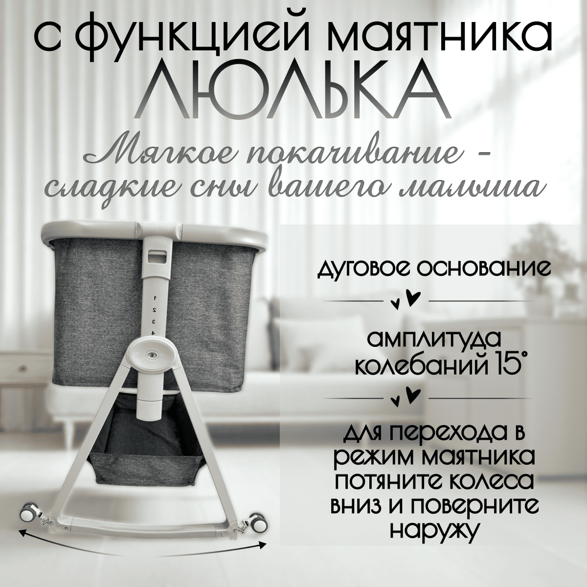 Плавное укачивание: дуговое основание с амплитудой 15° помогает мягко убаюкивать малыша.