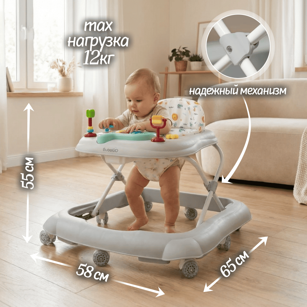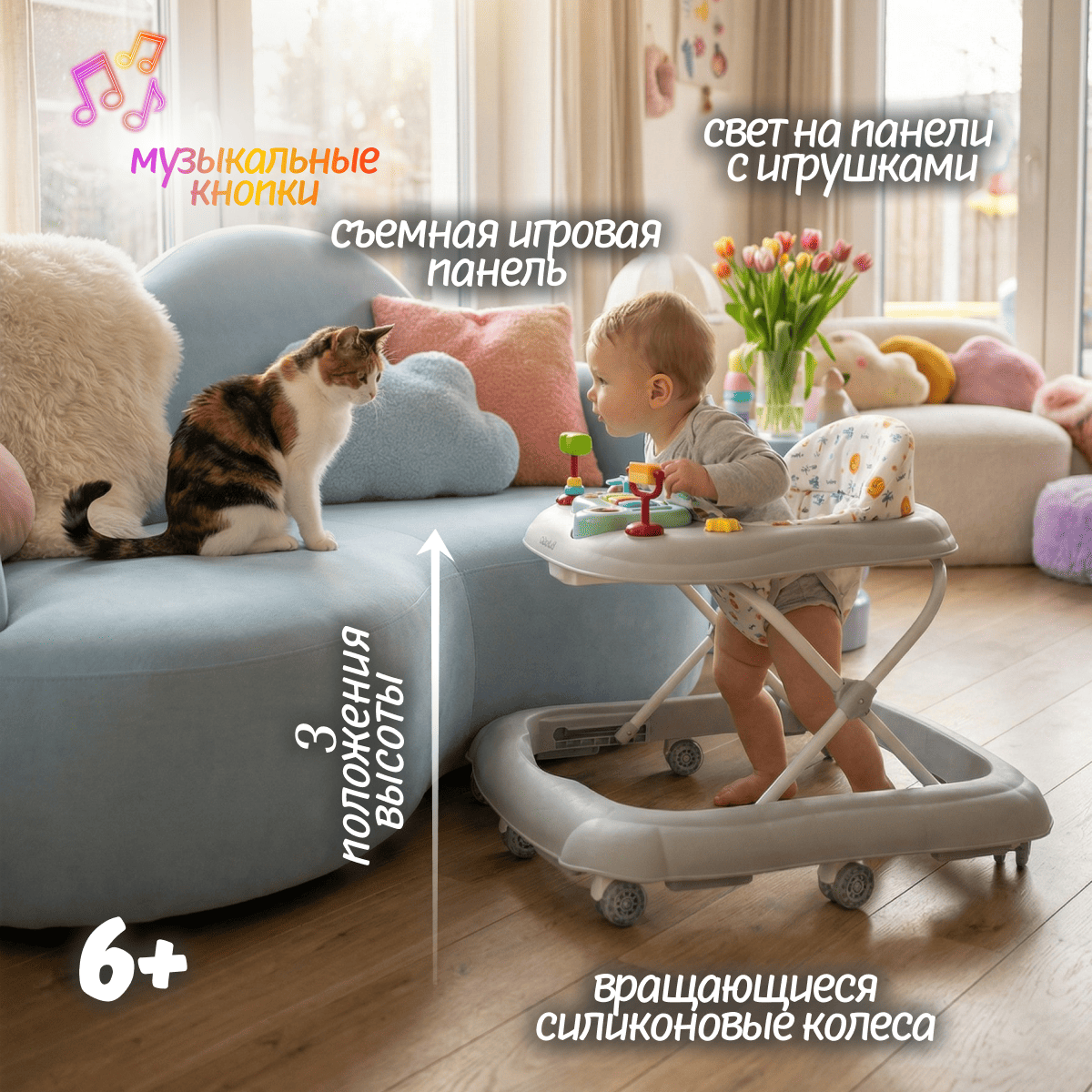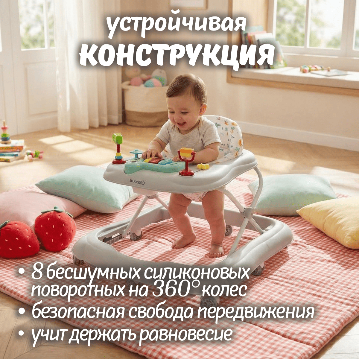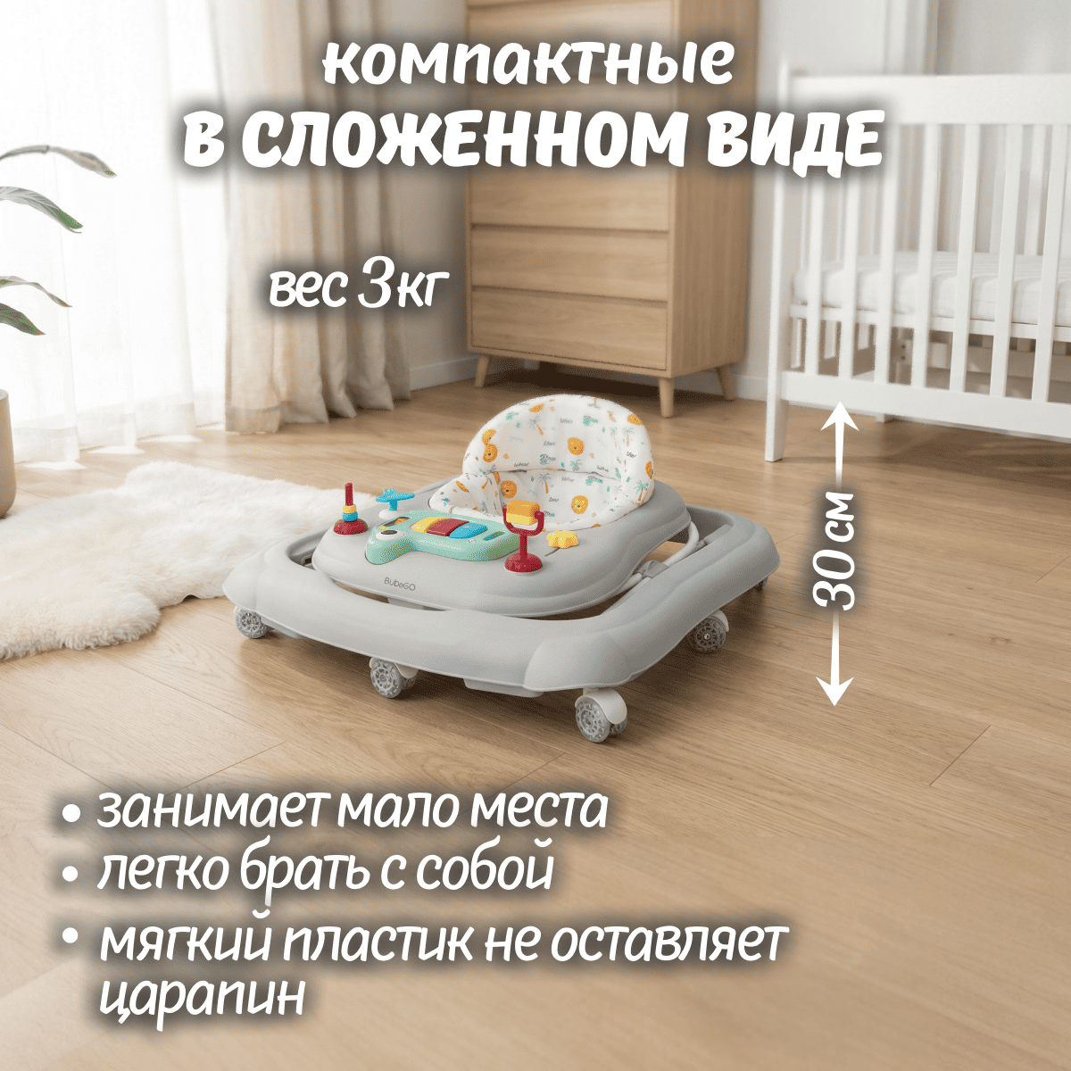 Колёса не царапают пол, помогают ребёнку увереннее освоить первые шаги и улучшить координацию.
