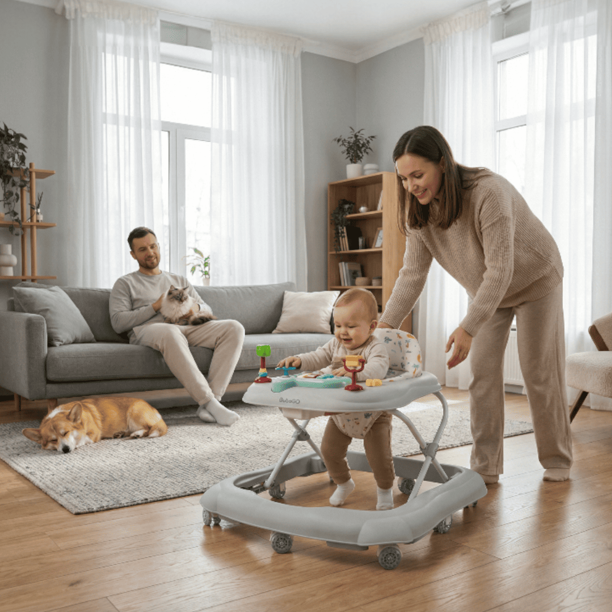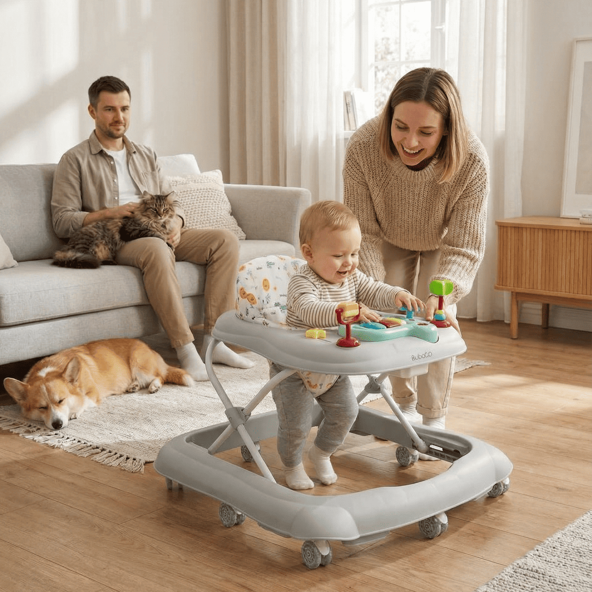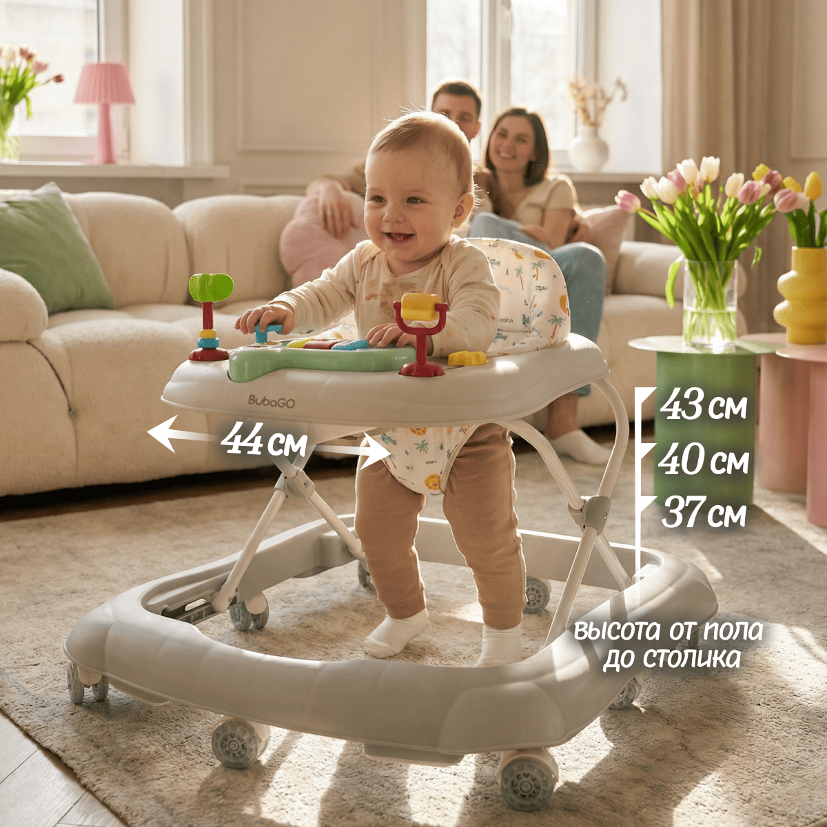 Ходунки BubaGO Flopi — это лёгкие и безопасные ходунки с игровой панелью для детей от 6 месяцев, которые помогают осваивать первые шаги и развивать моторику.