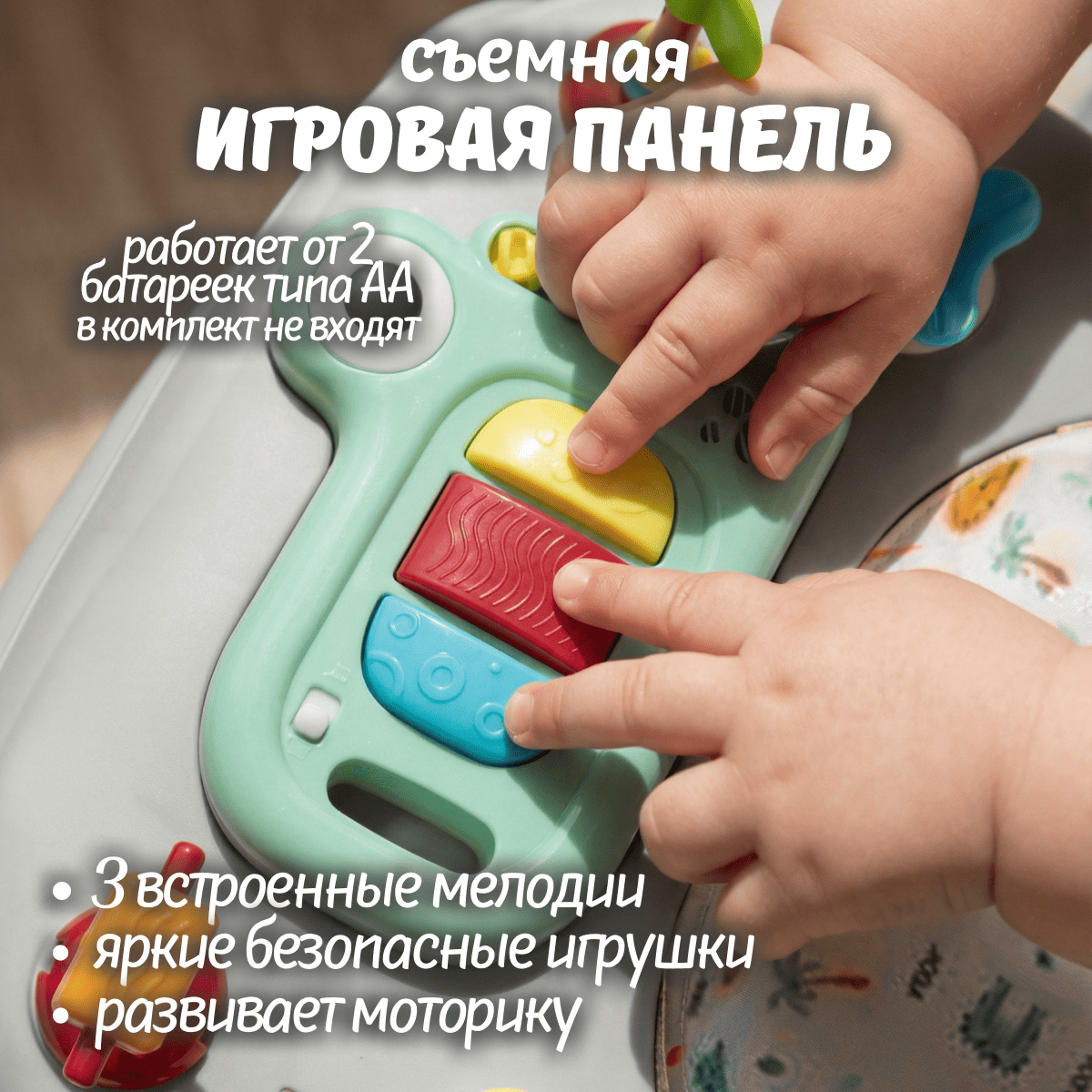 Яркая съёмная игровая панель с игрушками, кнопками, световыми эффектами и музыкальными мелодиями делает занятия увлекательными.