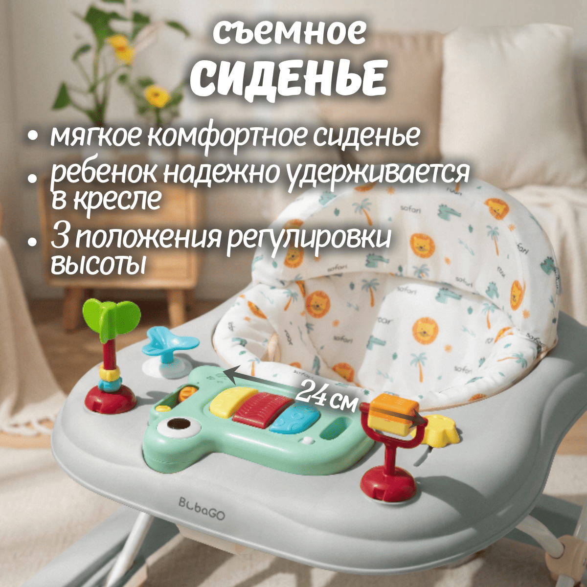 Мягкое сиденье со съёмным чехлом легко снять и постирать, обеспечивая ежедневную гигиену.