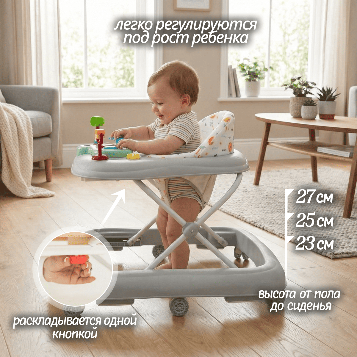 3 уровня регулировки высоты позволяют настроить ходунки так, чтобы ребёнок упирался в пол всей стопой, что важно для формирования правильной походки.
