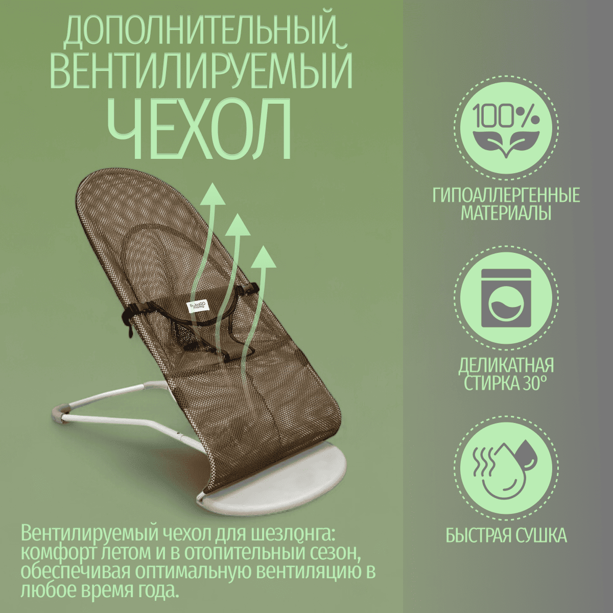 • Съёмный вентилируемый чехол и игрушки на дуге упрощают уход и делают отдых малыша интересным и полезным.