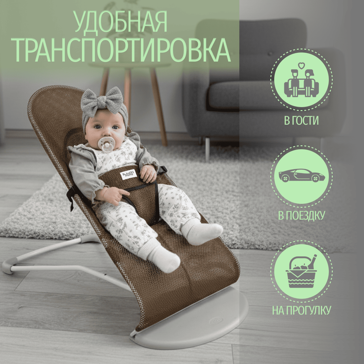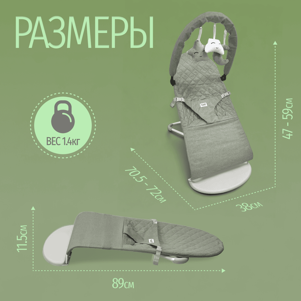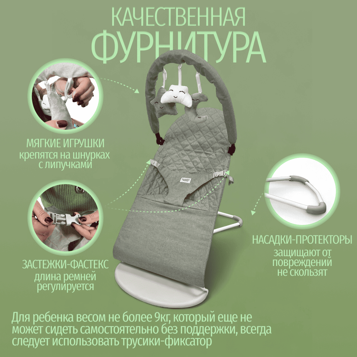 • Мягкое укачивание: шезлонг плавно качается от движений ребёнка или лёгкого толчка родителей, помогая успокоить и уложить малыша спать.