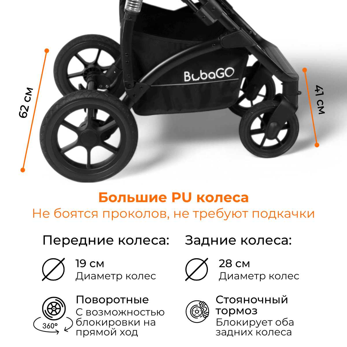 Большие колёса из ПУ: задние 28 см, передние поворотные 19 см с фиксацией для проходимости и устойчивости.