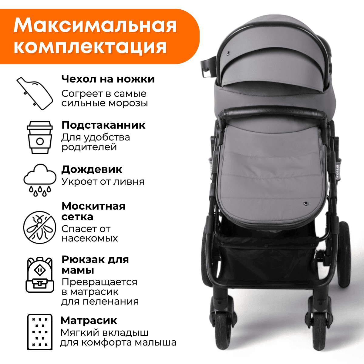 Полный набор аксессуаров: тёплый чехол на ножки, дождевик, москитная сетка, подстаканник, матрас-вкладыш, рюкзак для мамы.