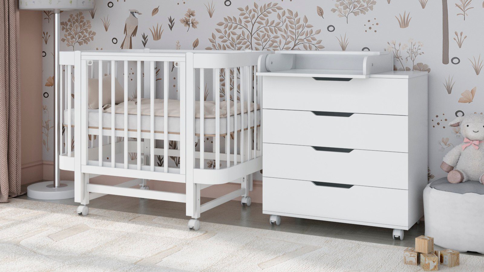 Детская кроватка Tesoro Mimi — премиум кроватка для новорождённых с продольным маятником, опускающейся спинкой и возможностью использовать как приставную.
