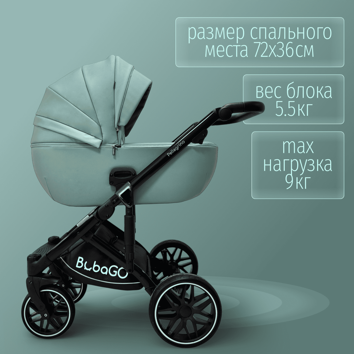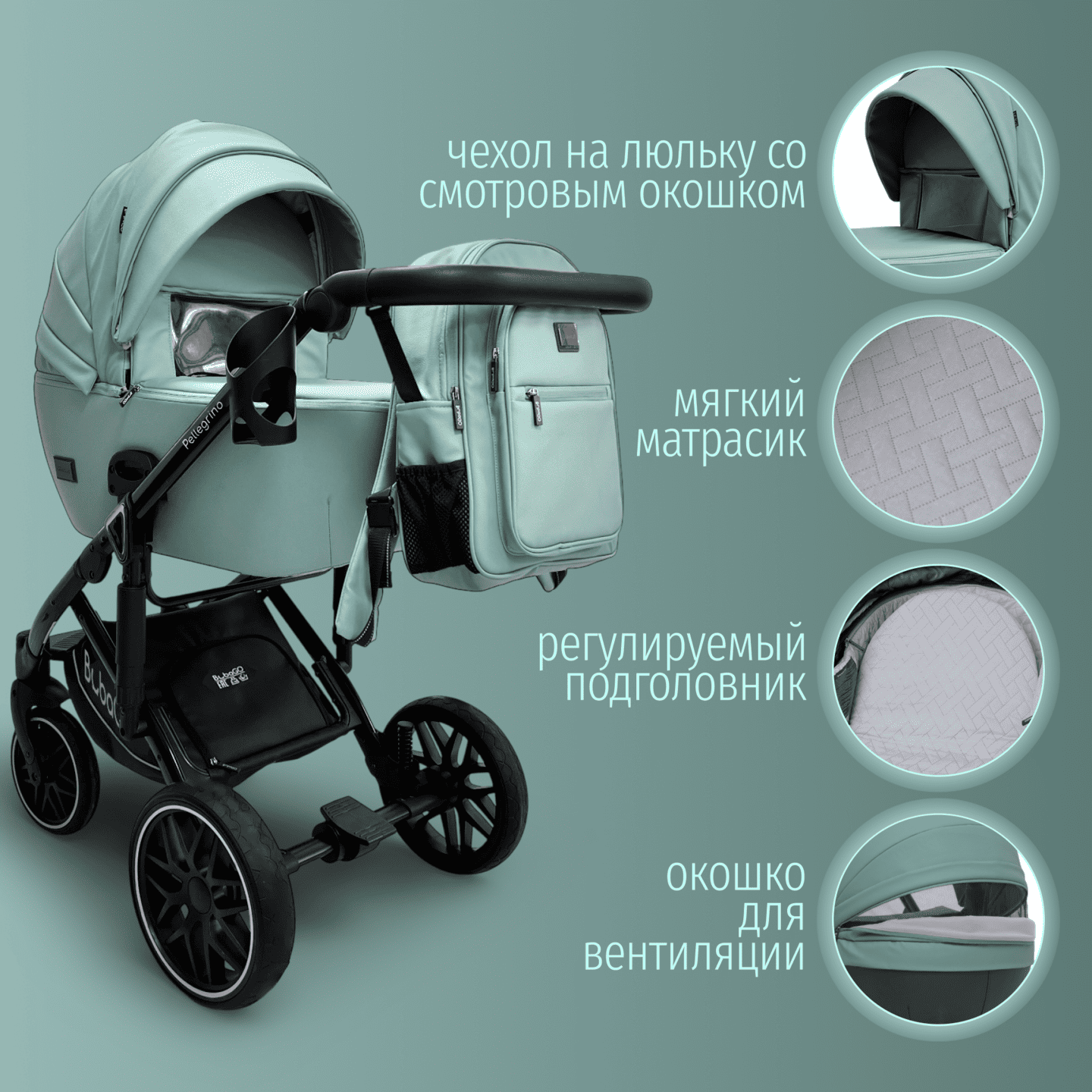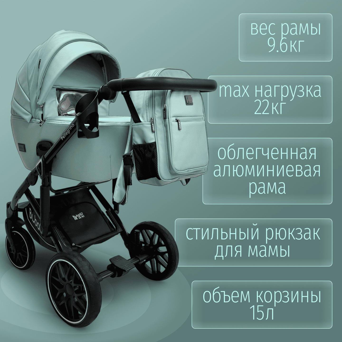 BubaGO Pellegrino 3-в-1 — модульная коляска с люлькой, прогулочным блоком и автолюлькой 0+, выполненная из премиальной экокожи, с легкой алюминиевой рамой, полнопружинной амортизацией и большими PU‑колесами для комфортных прогулок в любое время года.
