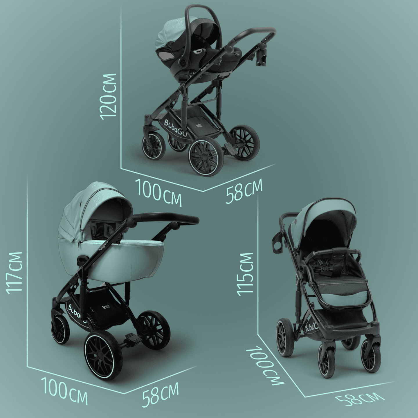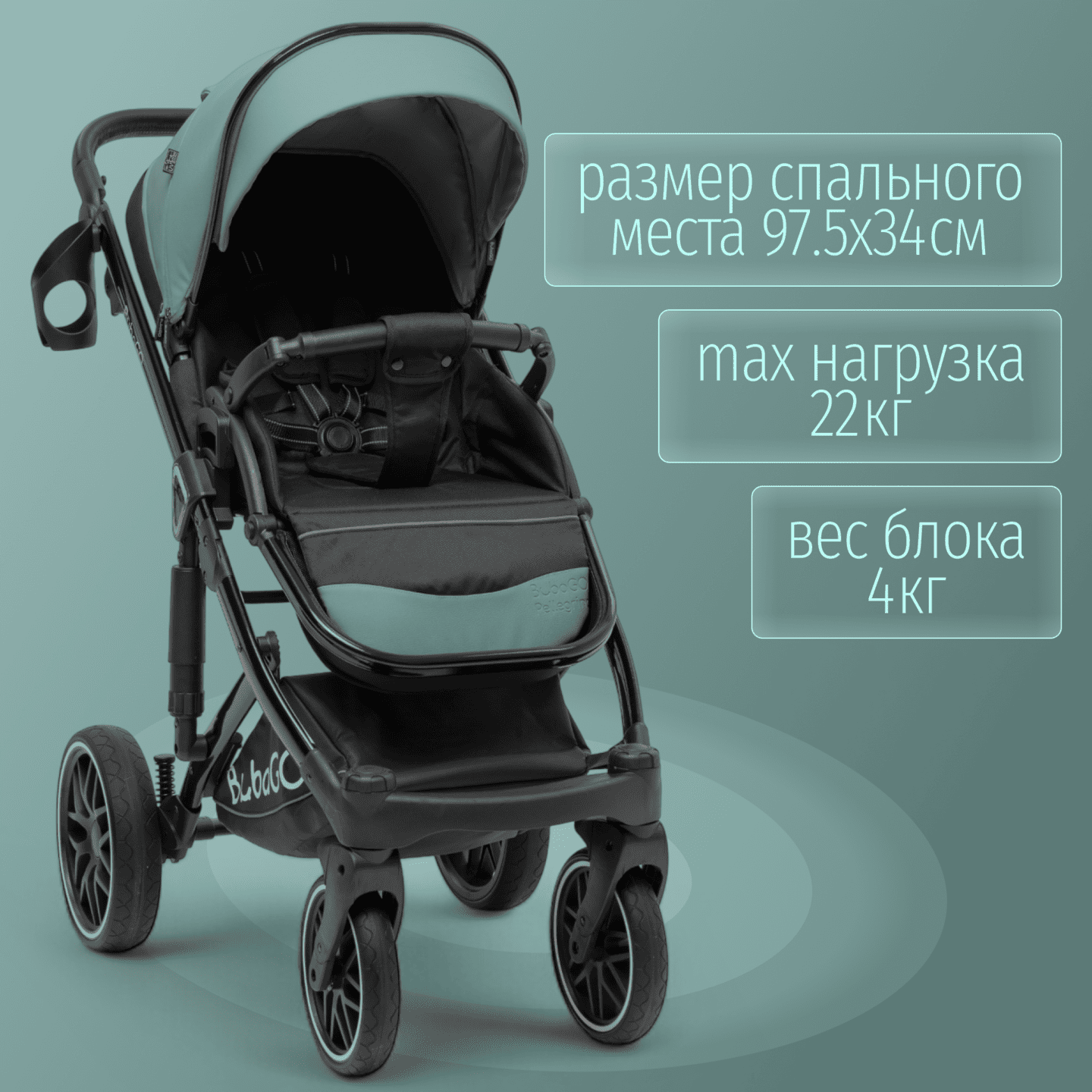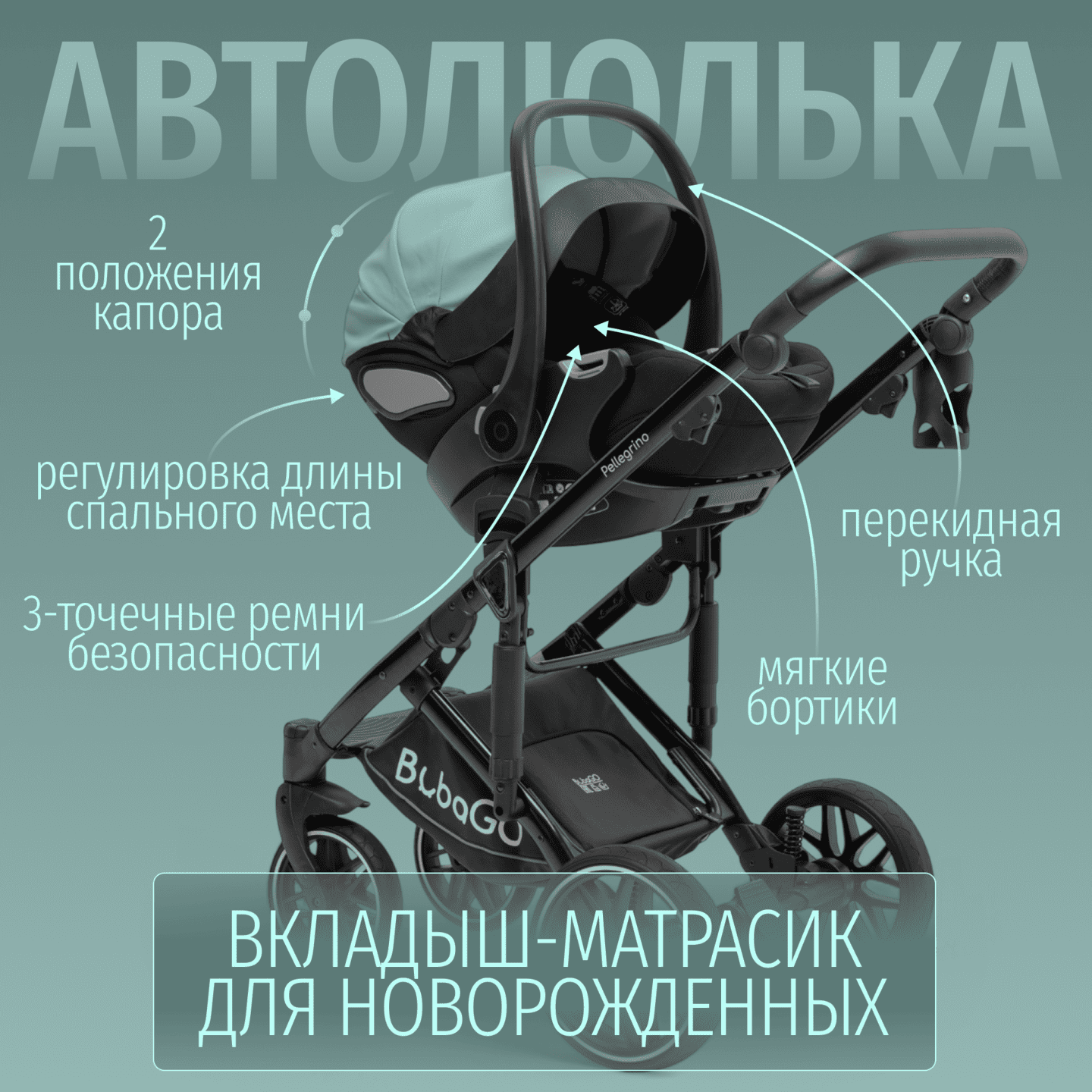 BubaGO Pellegrino 3-в-1 — модульная коляска с люлькой, прогулочным блоком и автолюлькой 0+, выполненная из премиальной экокожи, с легкой алюминиевой рамой, полнопружинной амортизацией и большими PU‑колесами для комфортных прогулок в любое время года.