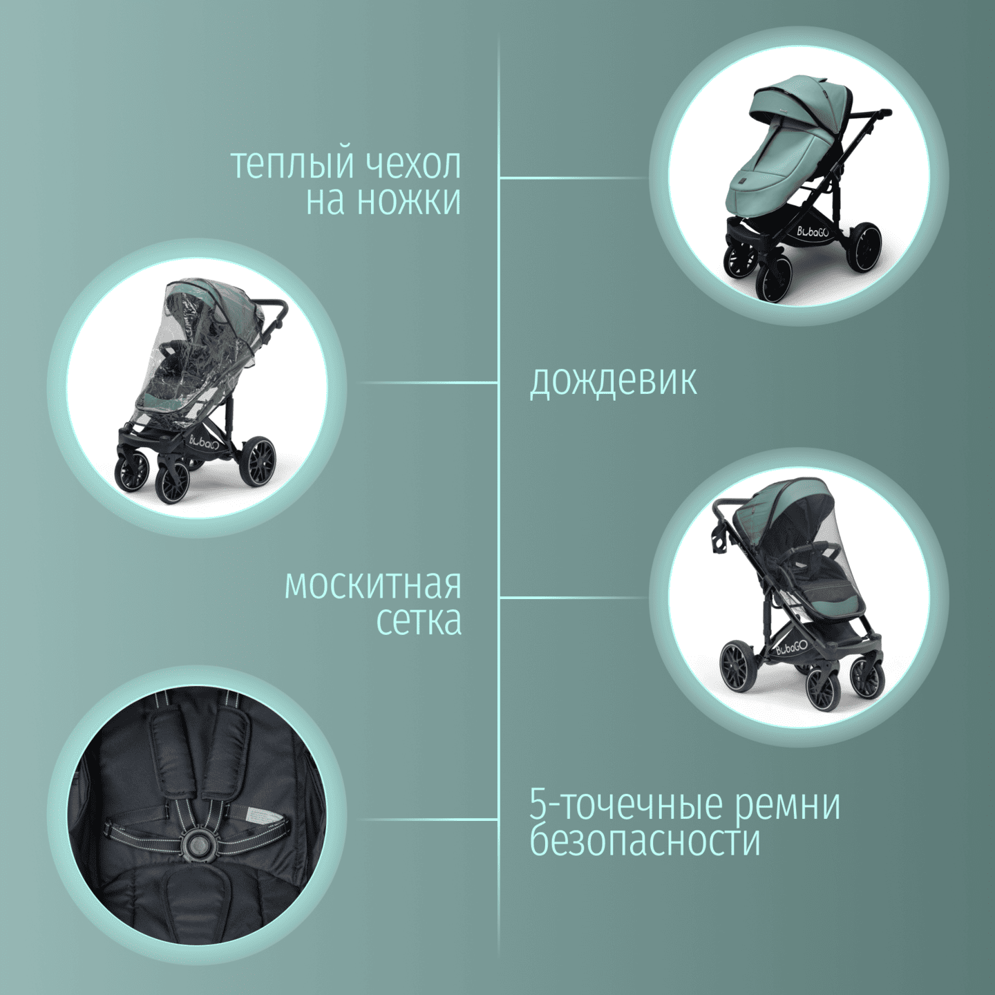 • В комплект входят: подстаканник, чехол на ножки, москитная сетка, дождевик, рюкзак, муфта для рук.
