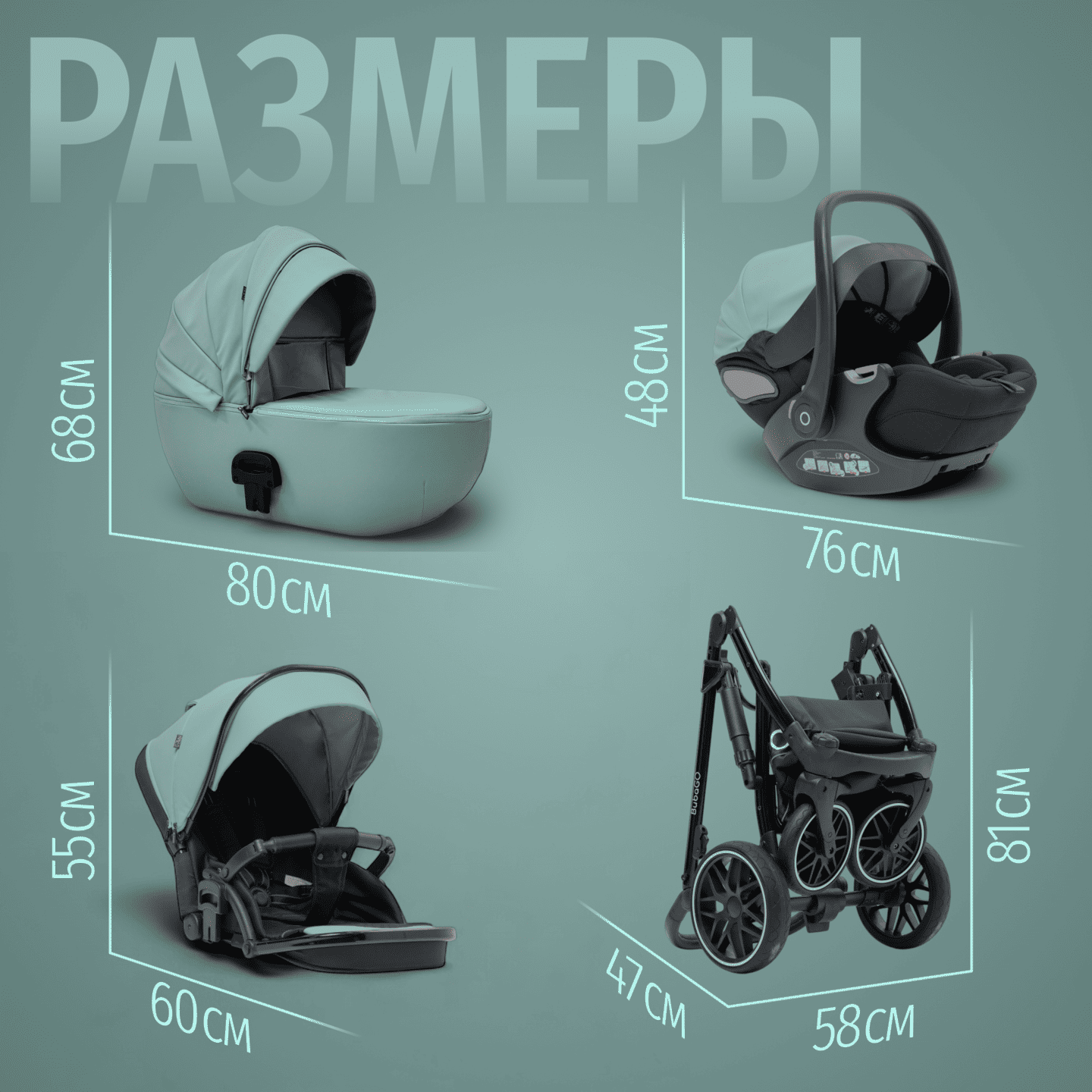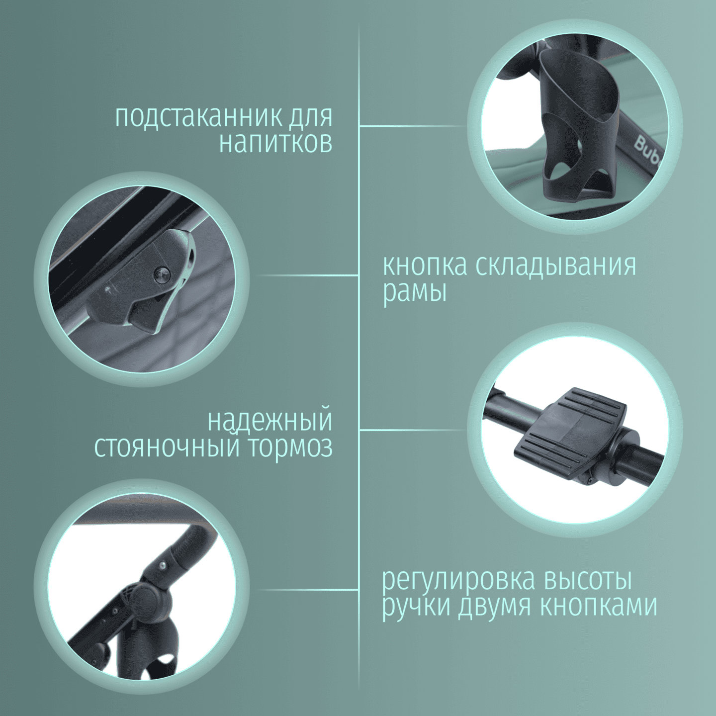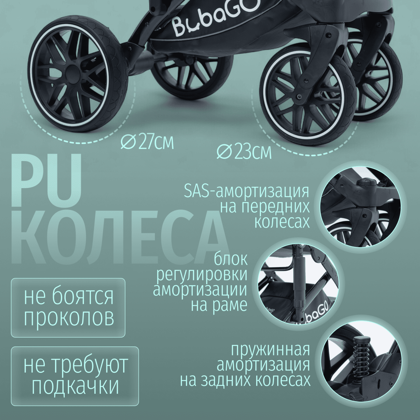 • Полнопружинная независимая амортизация всех колес, SAS‑система и большие PU‑колеса для уверенного хода по асфальту, плитке, грунту и снегу; настройка жесткости/мягкости амортизации.