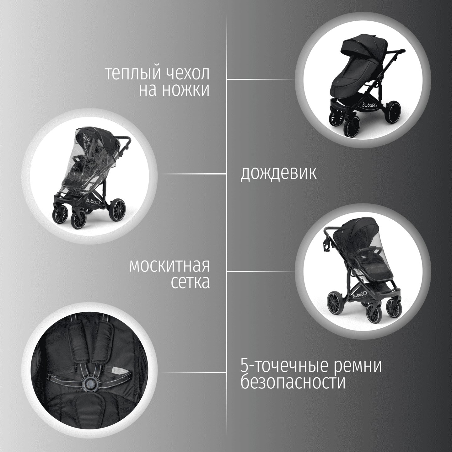 В комплект входят: подстаканник, чехол на ножки, москитная сетка, дождевик, рюкзак, муфта для рук.
