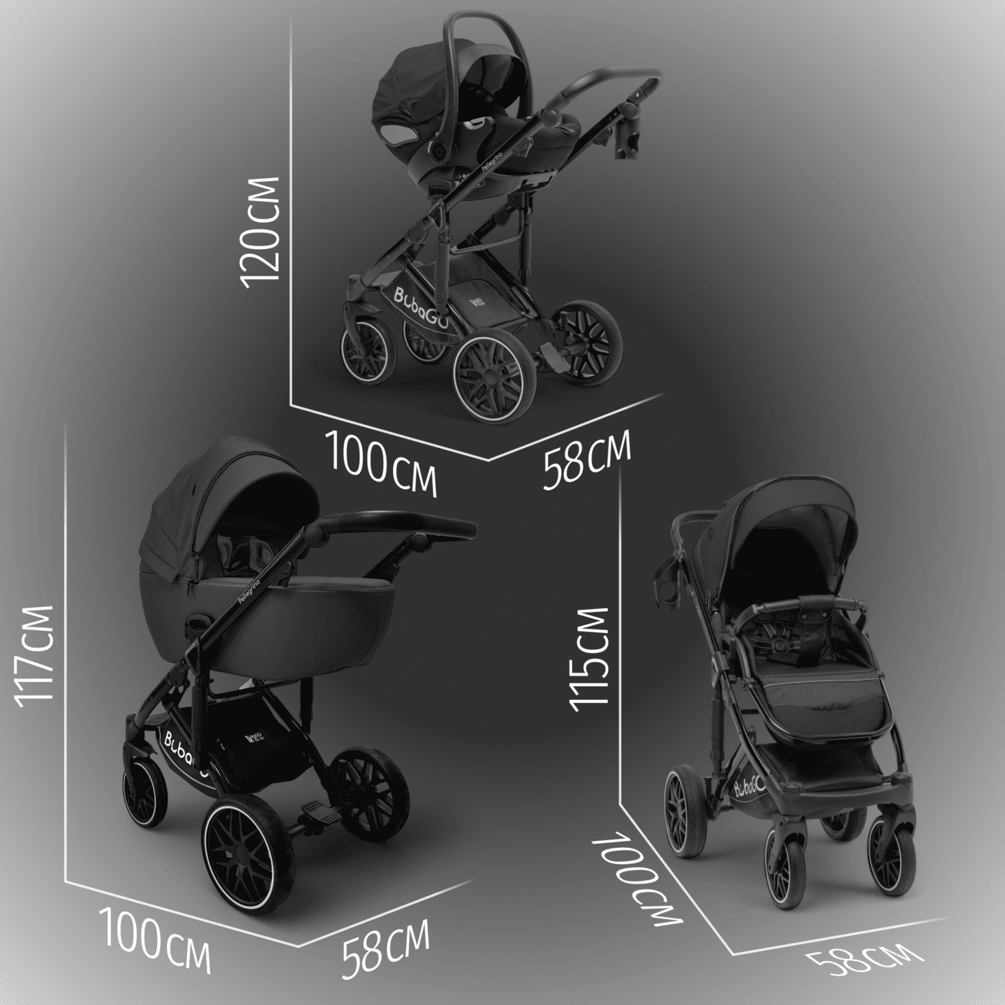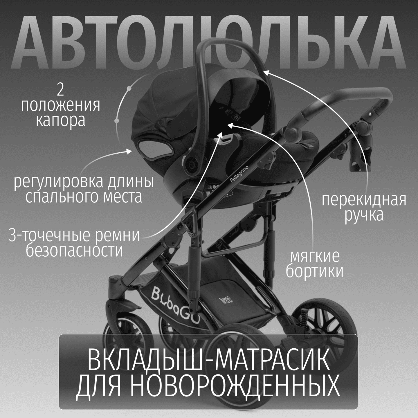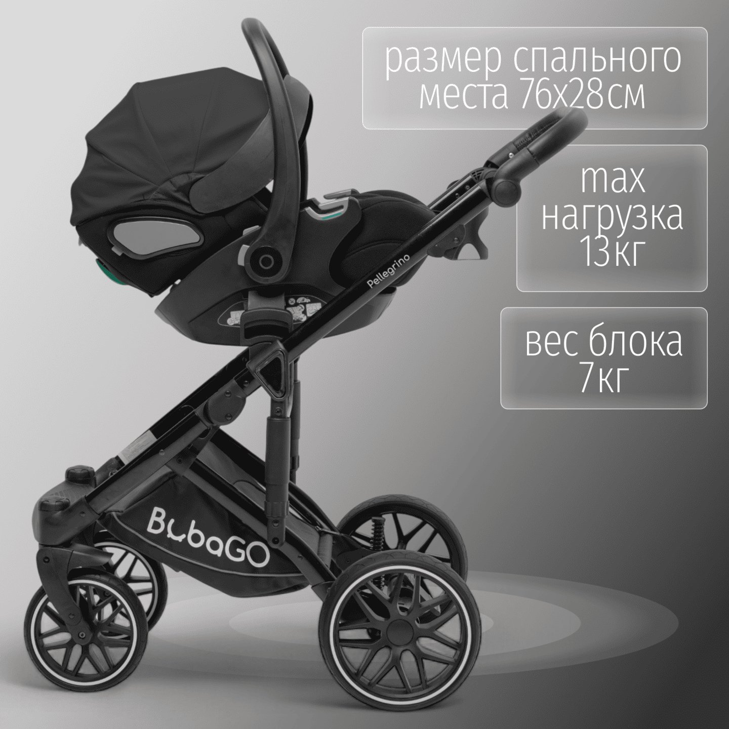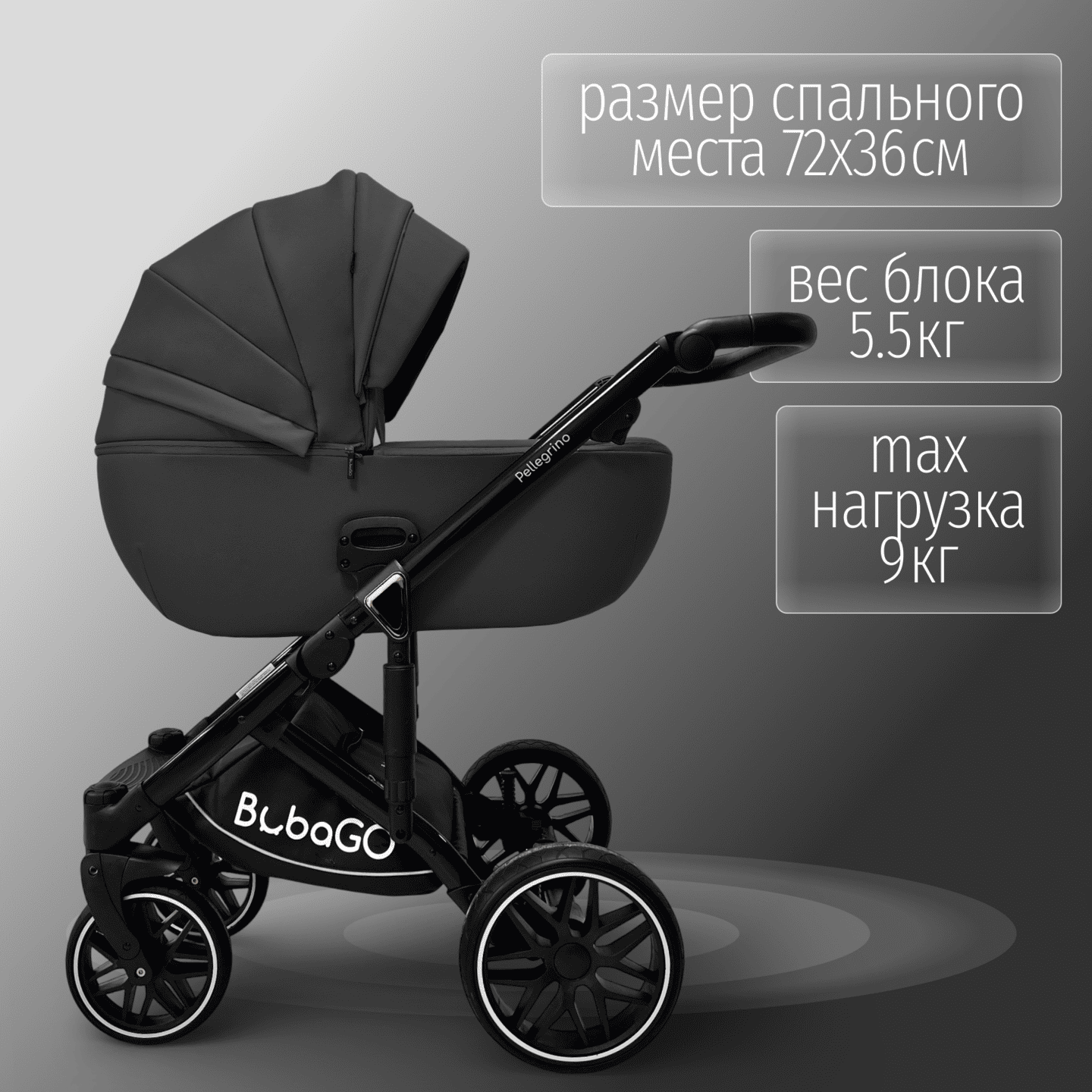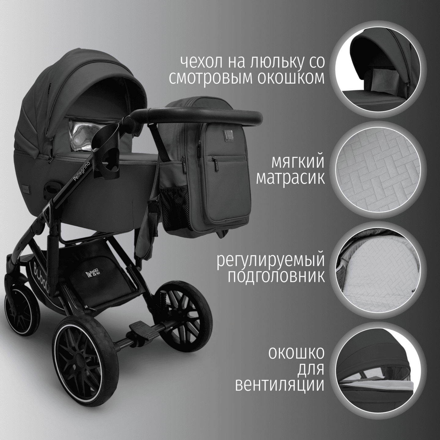Модульная коляска BubaGO Pellegrino 3-в-1 из экокожи с люлькой, прогулочным блоком и автолюлькой, рассчитанная с рождения до 22 кг и адаптированная под все сезоны.