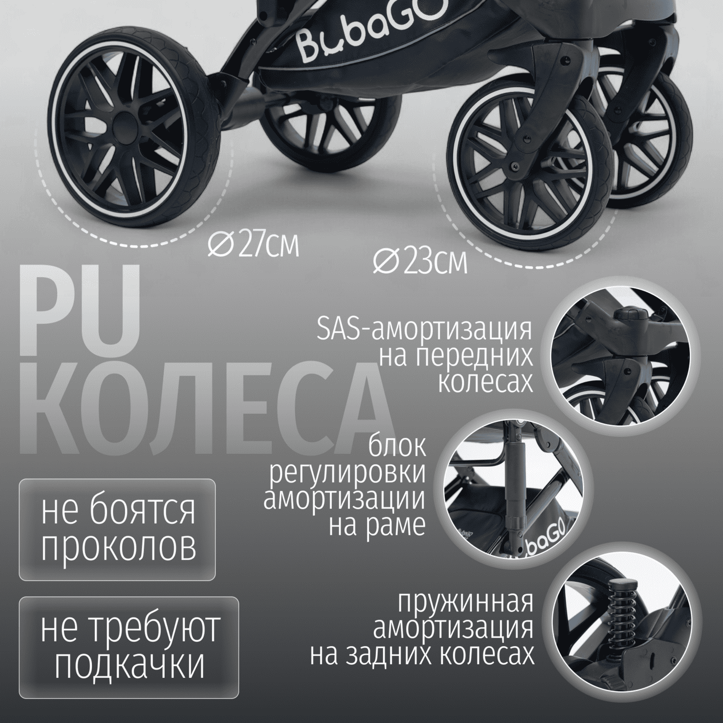 Полнопружинная независимая амортизация всех колес, SAS‑система и большие PU‑колеса для уверенного хода по асфальту, плитке, грунту и снегу; настройка жесткости/мягкости амортизации.
