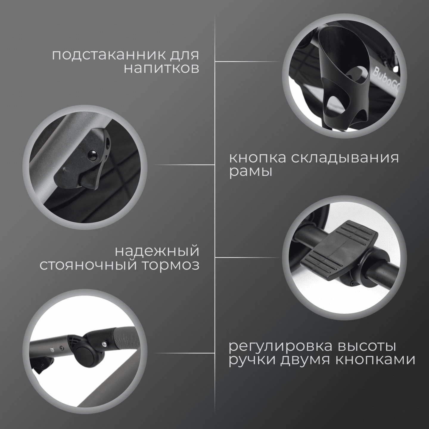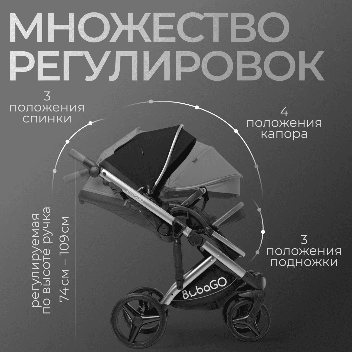 • Регулируемая по высоте ручка даёт возможность удобно вести коляску родителям разного роста.