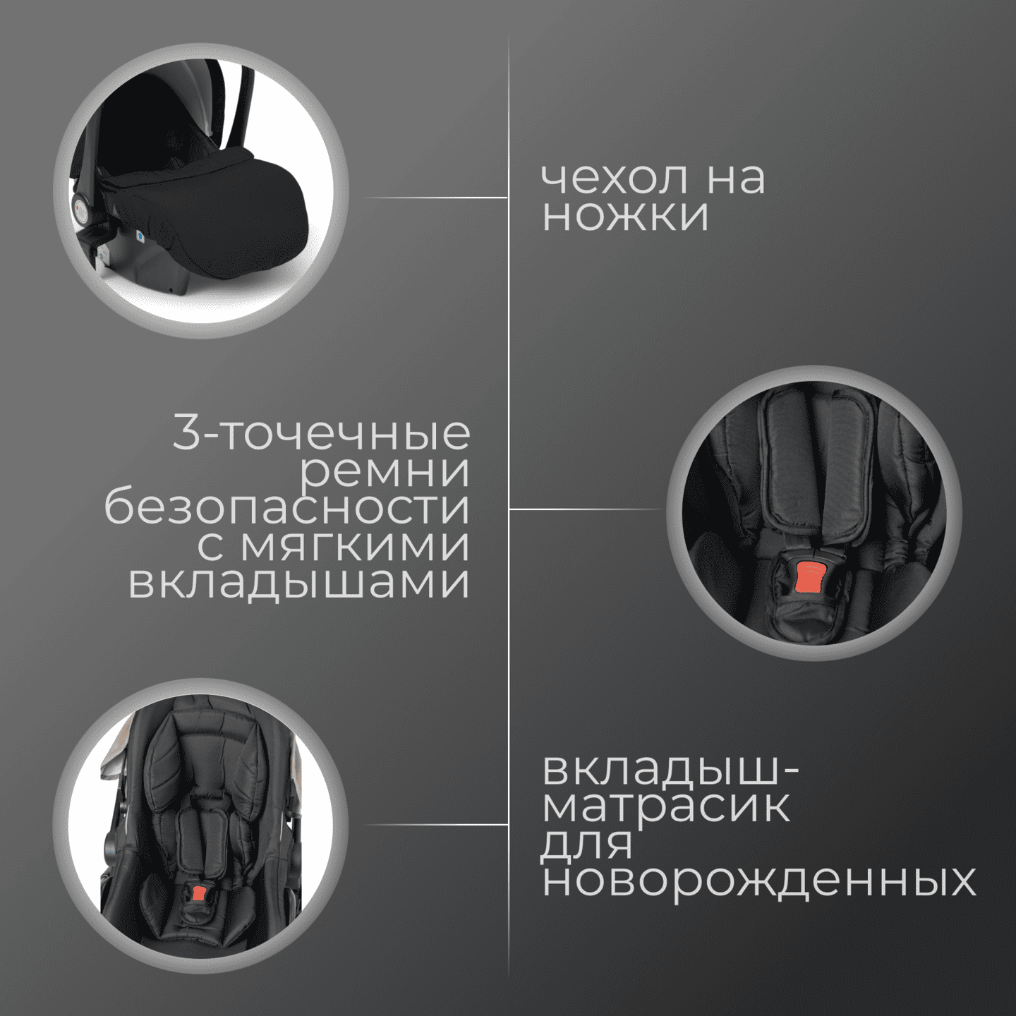 • 5‑точечные ремни удерживают ребёнка в правильном положении, автолюлька превращается в мобильную «дорожную» люльку.