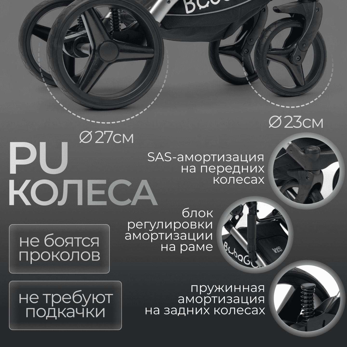 • Усиленная регулируемая амортизация снижает вибрации и защищает позвоночник ребёнка.