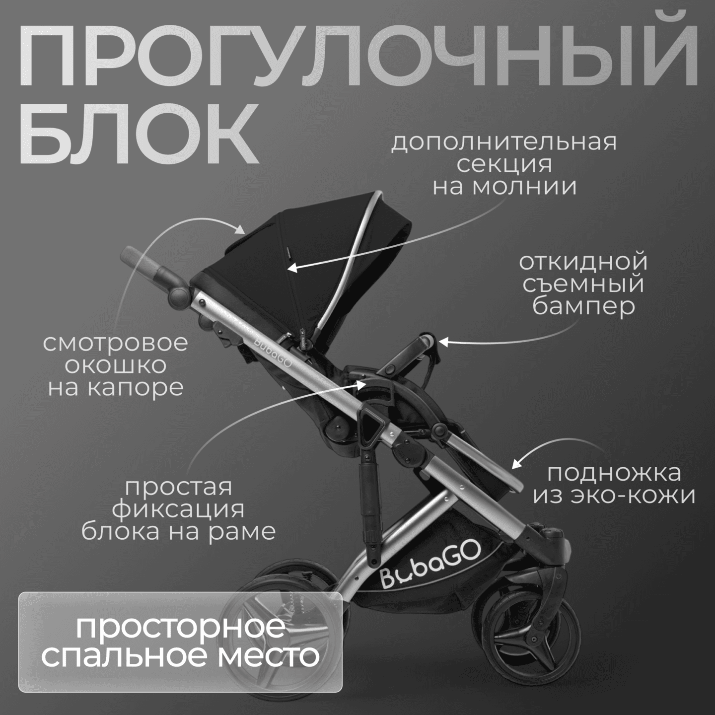 • Просторное сиденье с многопозиционной спинкой (от «сидя» до полностью «лёжа») и регулируемой подножкой под разный рост ребёнка.