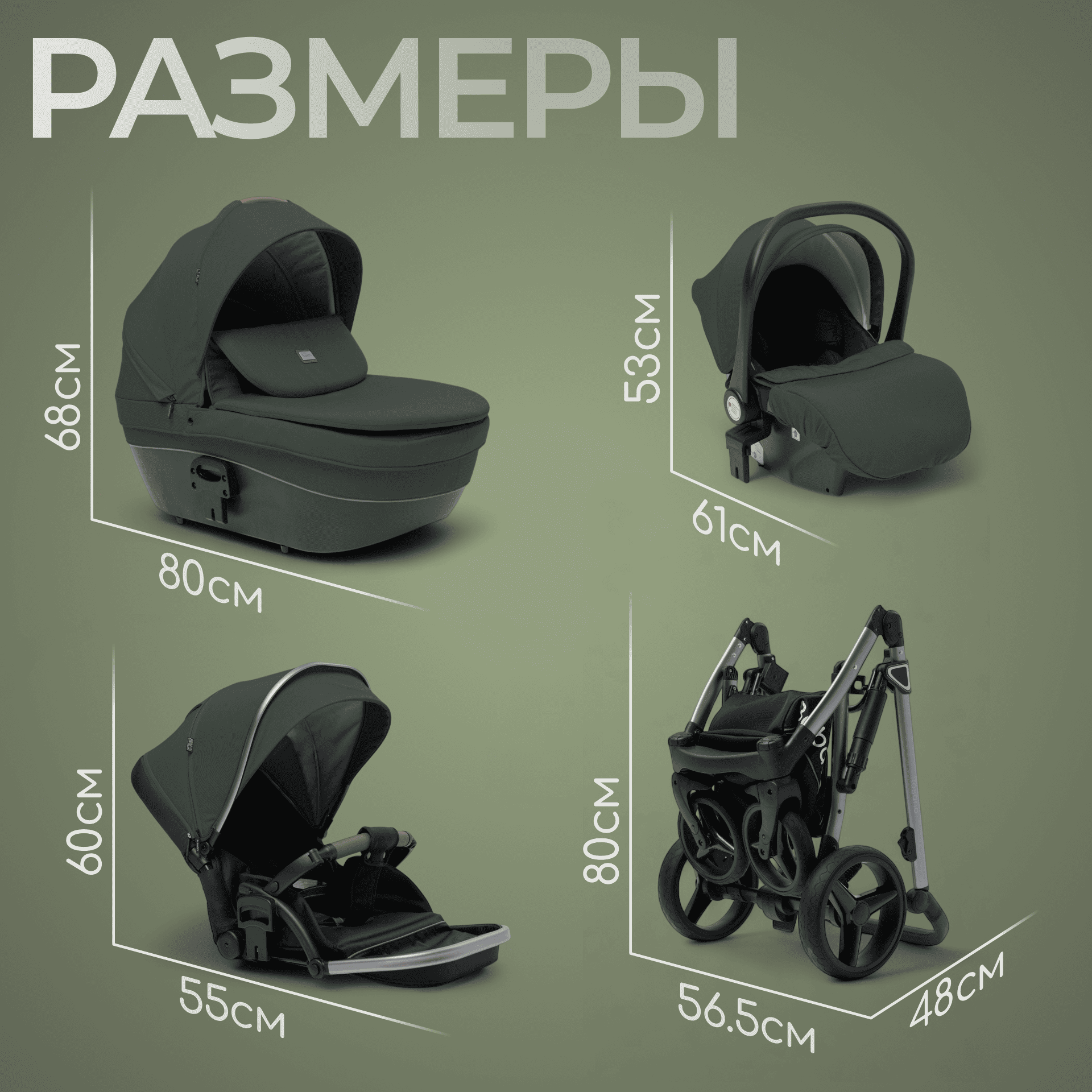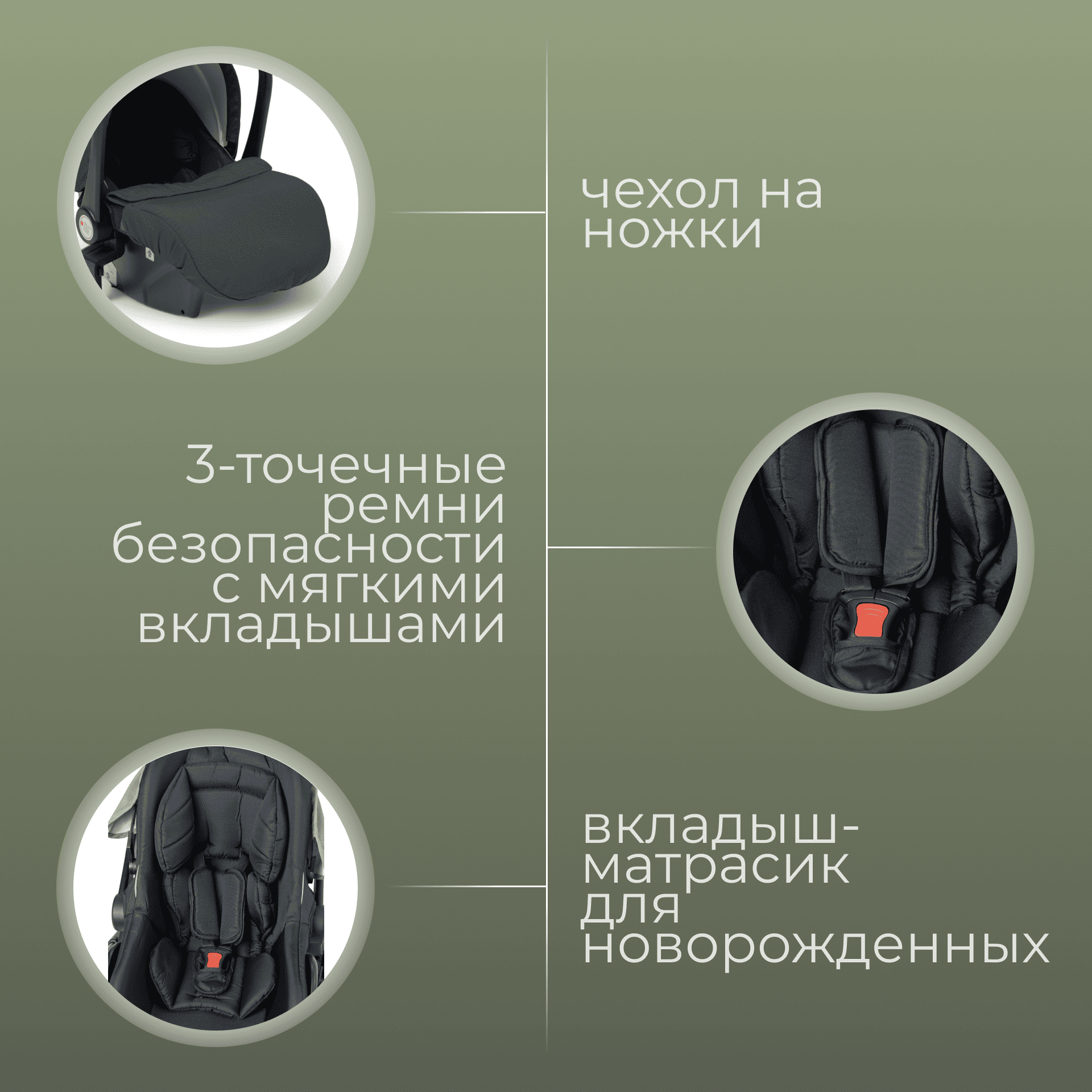 Универсальный комплект «3-в-1» закрывает все потребности: прогулки, поездки в машине и путешествия без дополнительных покупок.
