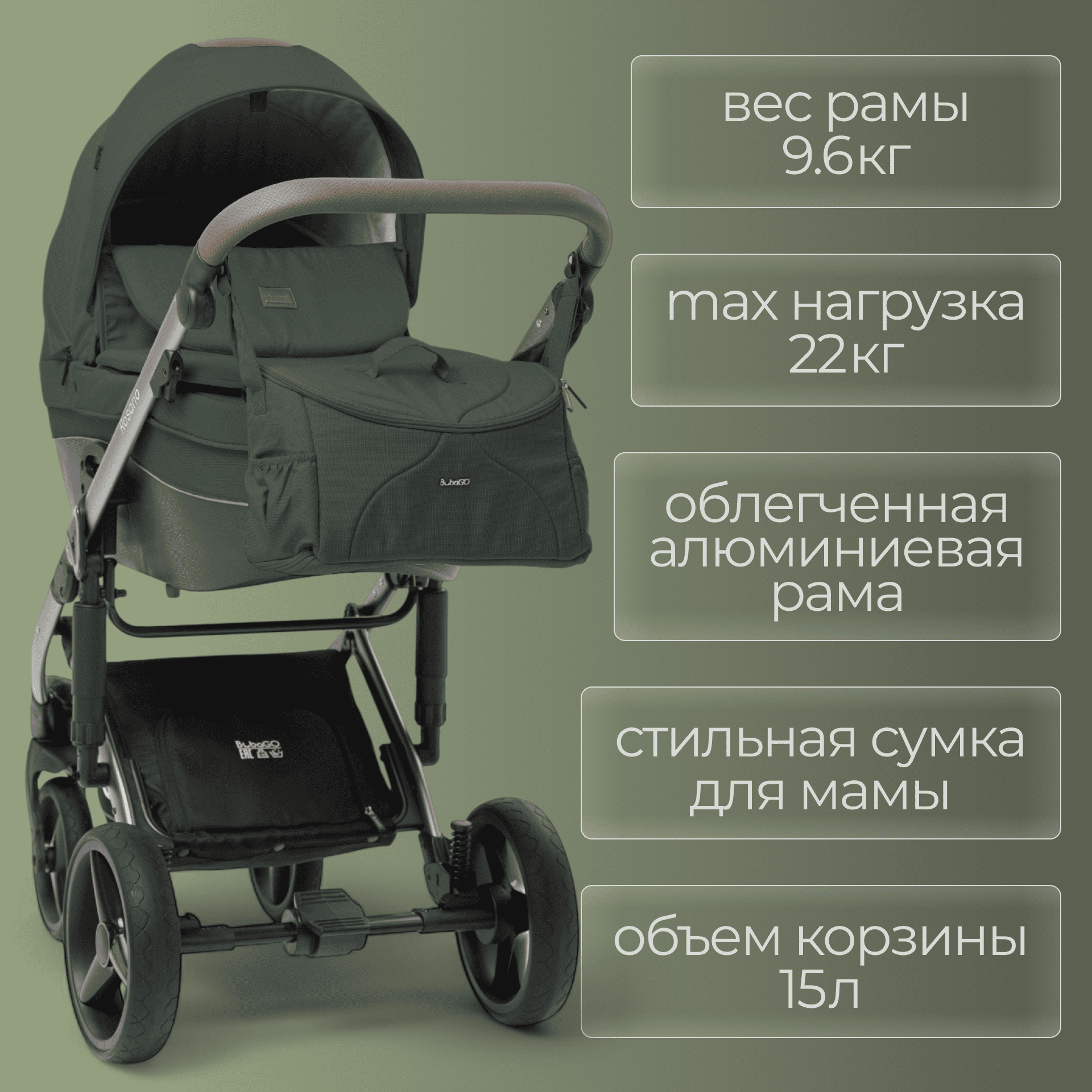 Регулируемая по высоте ручка, быстрое и компактное сложение «книжкой», большая закрытая корзина до 5 кг и сумка для родителей в комплекте.