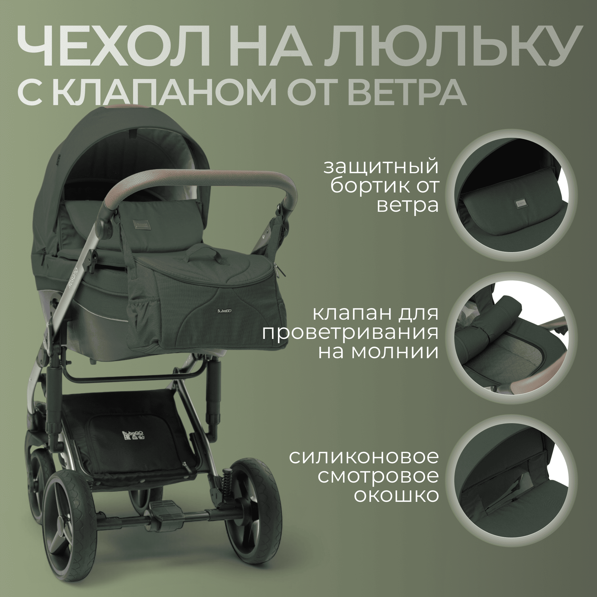 Большой капюшон с дополнительной секцией на молнии и солнцезащитным козырьком, в комплекте дождевик и москитная сетка.