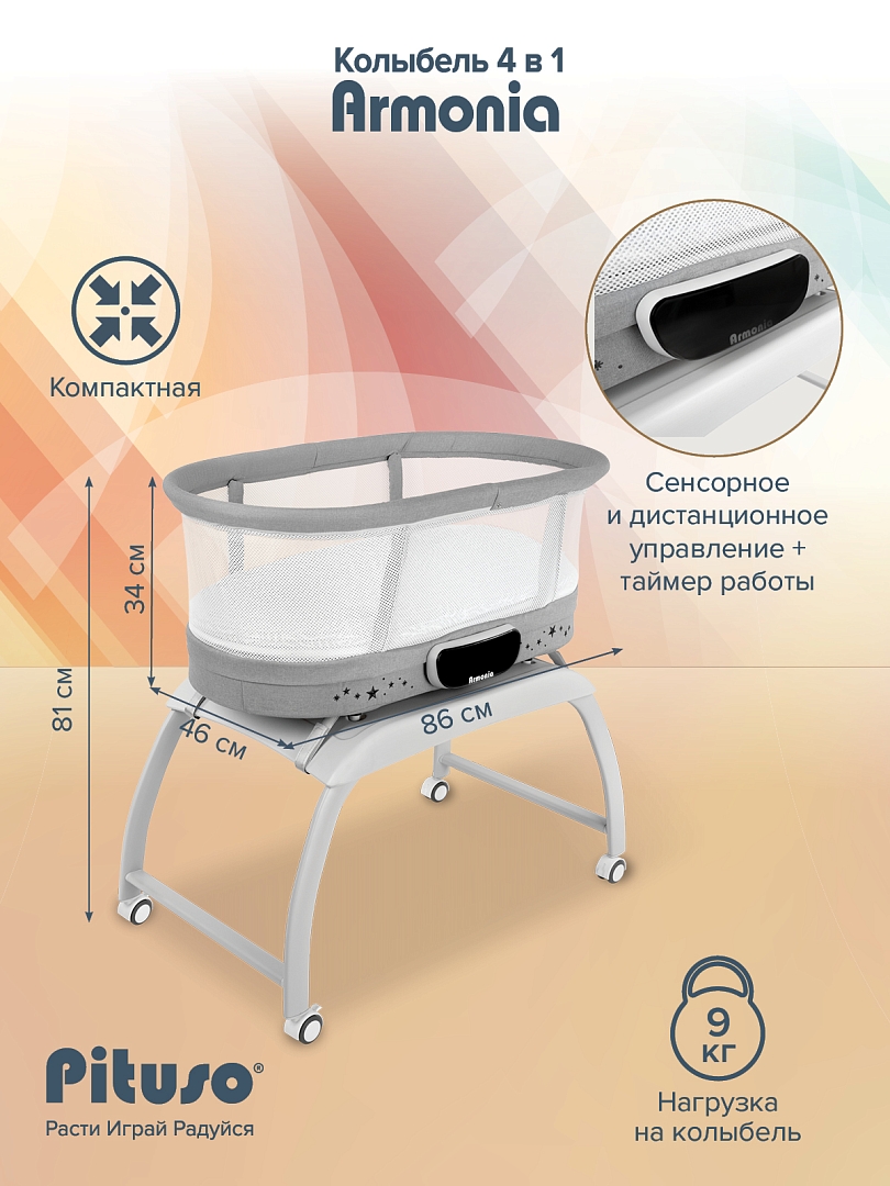 Электроколыбель Pituso Armonia — многофункциональная колыбель 4‑в‑1 для новорождённых, которая объединяет кроватку для сна, колыбель с автоматическим укачиванием, столик для переодевания и встроенные весы для контроля веса ребёнка в первые месяцы жизни.