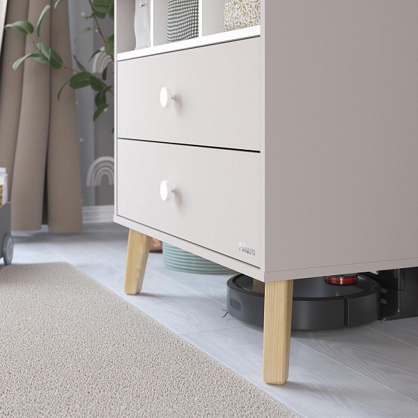 Высота ножек 18 см, благодаря чему под комодом удобно убираться и при необходимости можно использовать робот‑пылесос.