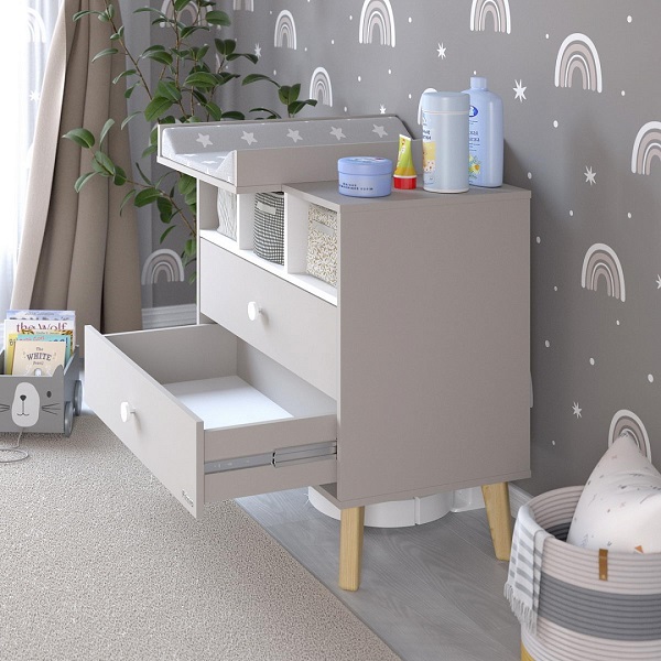Лаконичный внешний вид и универсальные оттенки позволяют сочетать комод с кроваткой и другими элементами мебели.