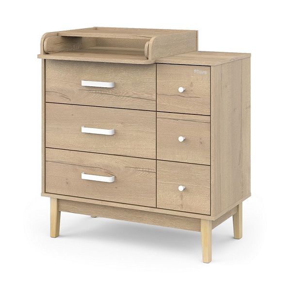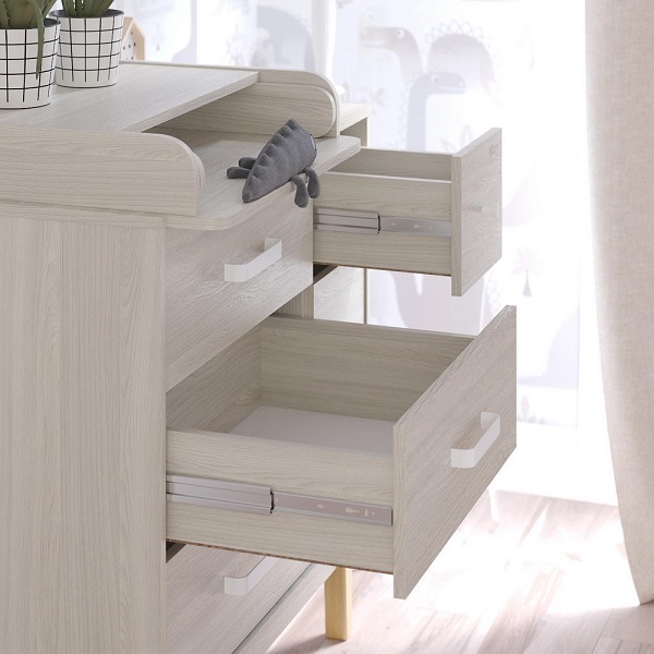 Шесть удобно расположенных ящиков (три больших и три маленьких) с металлическими белыми ручками позволяют раздельно хранить одежду, текстиль и мелкие аксессуары малыша.