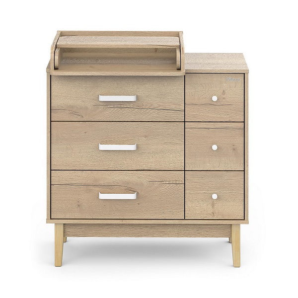 Раскладной пеленальный столик образует удобную пеленальную поверхность 52×79,1 см на высоте 89 см, его можно закрепить слева, справа или по центру, а при необходимости снять и использовать комод как обычный бельевой.