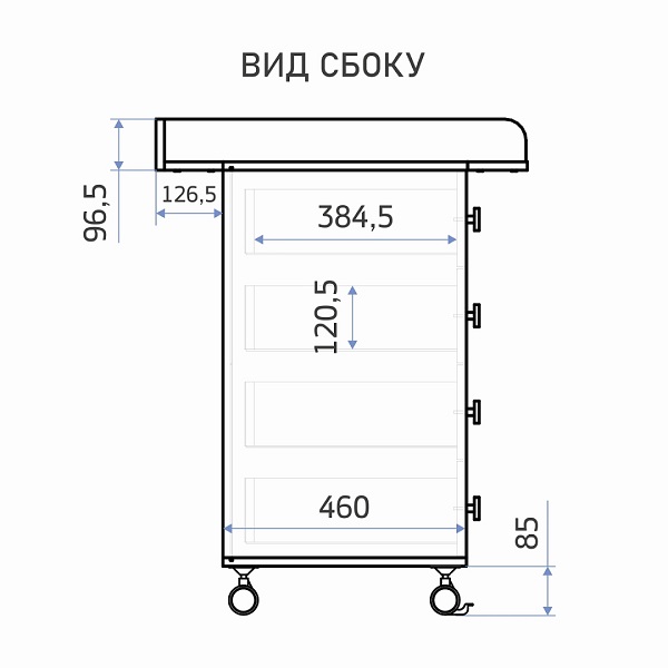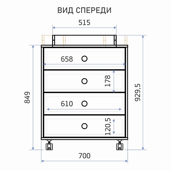 Четыре вместительных ящика на шариковых телескопических направляющих плавно выдвигаются, ручки с матовыми шляпками имеют прочную металлическую основу, а комод установлен на колёсах с фиксаторами для лёгкого перемещения по комнате.