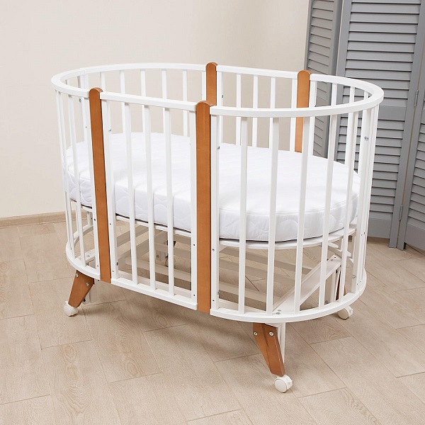 Варианты трансформации: круглая кровать, круглая кровать на маятнике, овальная кровать на стойках, на колесах, на поперечном и продольном маятнике, а также набор «стол и два стула» для подросшего ребенка.