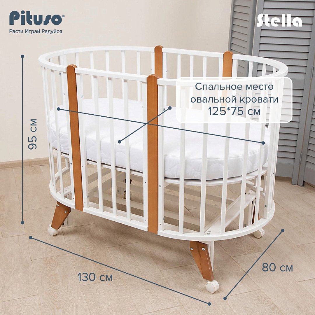 Круглая‑овальная кровать‑трансформер Pituso Stella для детей от 0 до 3 лет с ложем 75×75 см (колыбель) и 125×75 см (овальная кровать), выполненная из березовой древесины и МДФ, с двумя уровнями ложа (30 и 50 см от пола) и большим количеством вариантов сборки: круглая и овальная кровать (на ножках, маятнике или колесах), а также стол и 2 стула.