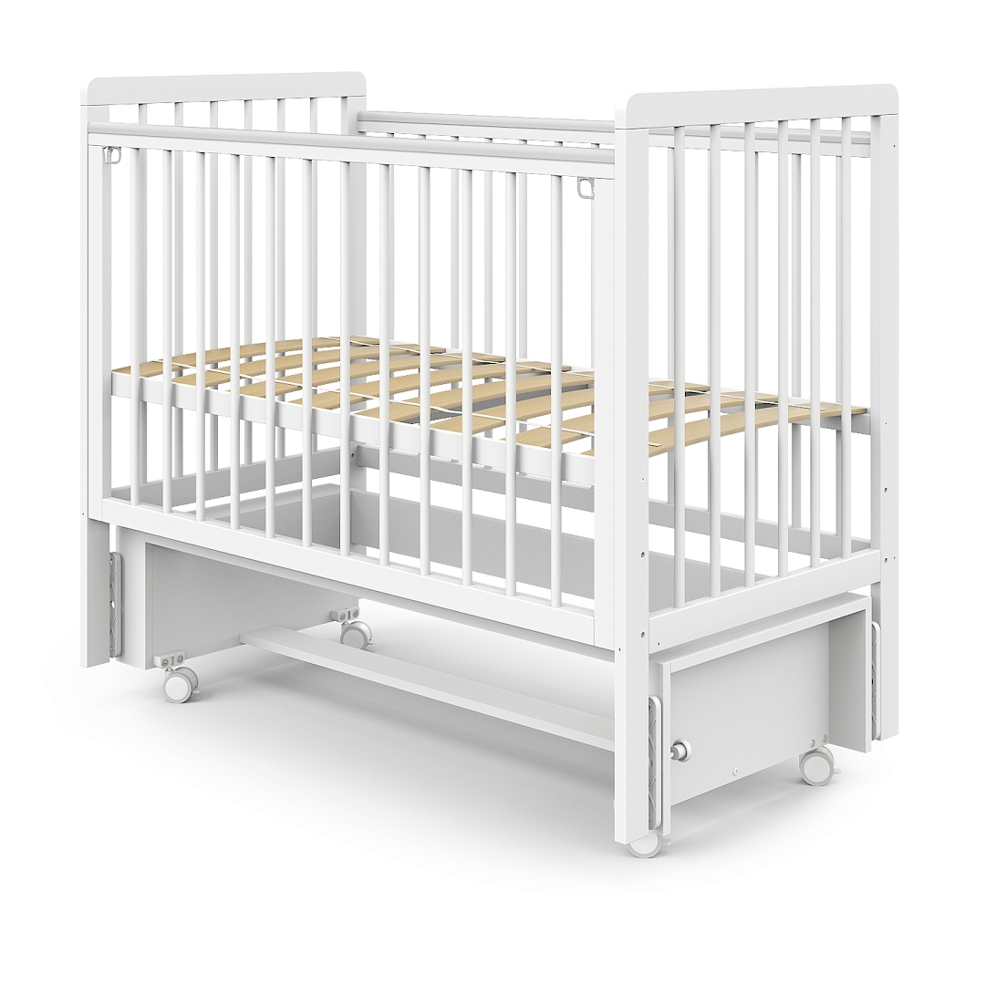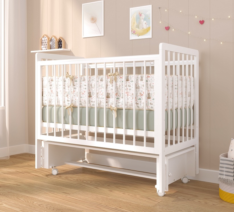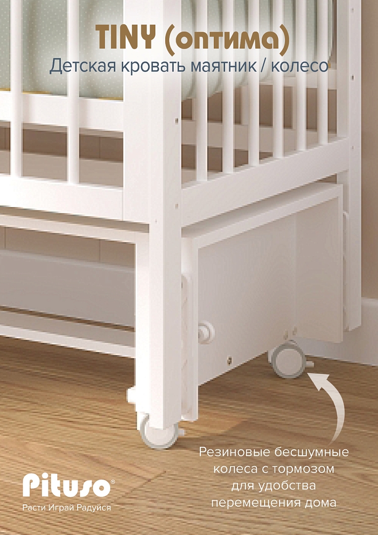 Резиновые бесшумные колесики с тормозами на всех четырех колесах позволяют легко перемещать кроватку по дому и надежно фиксировать ее в нужной точке.