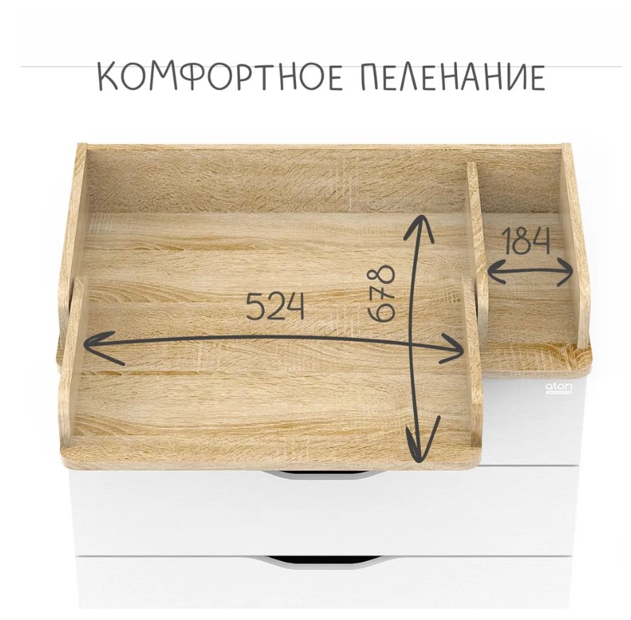 Раскладной пеленальный столик размером 68×52 см имеет скруглённые углы, как и столешница комода, что повышает комфорт и безопасность при пеленании.