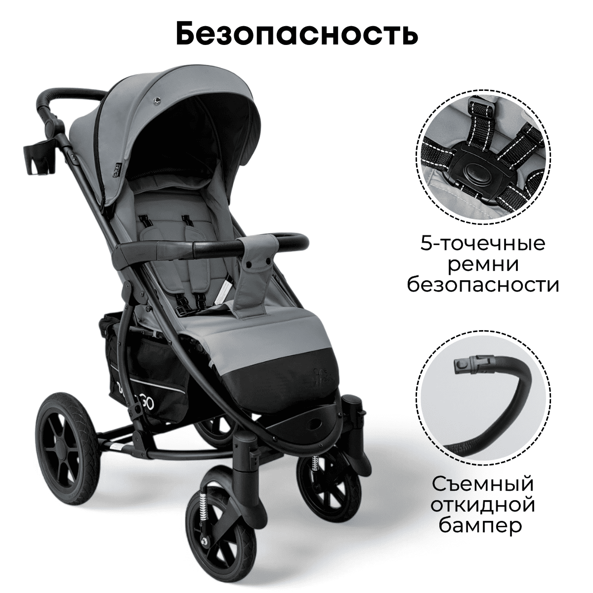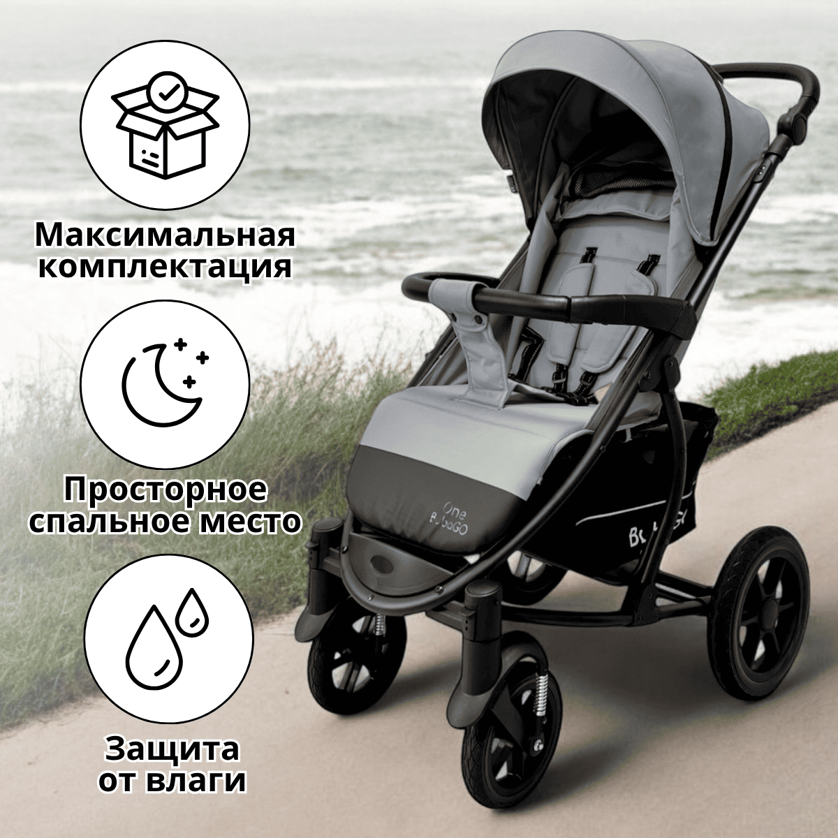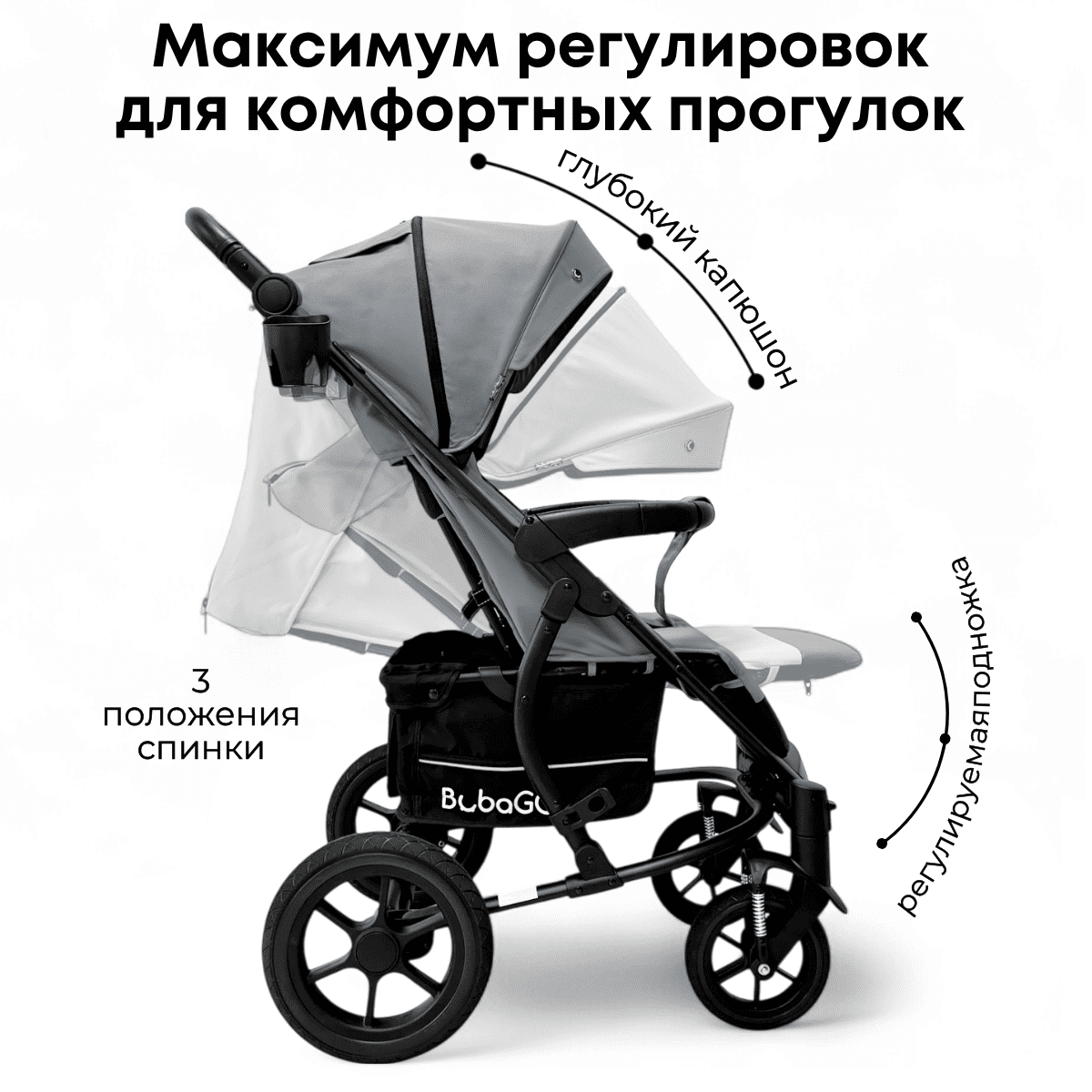 Прогулочная коляска BubaGO Model One — всесезонная коляска с усиленной рамой, большими колесами и продуманным комфортом для ребёнка и родителей.