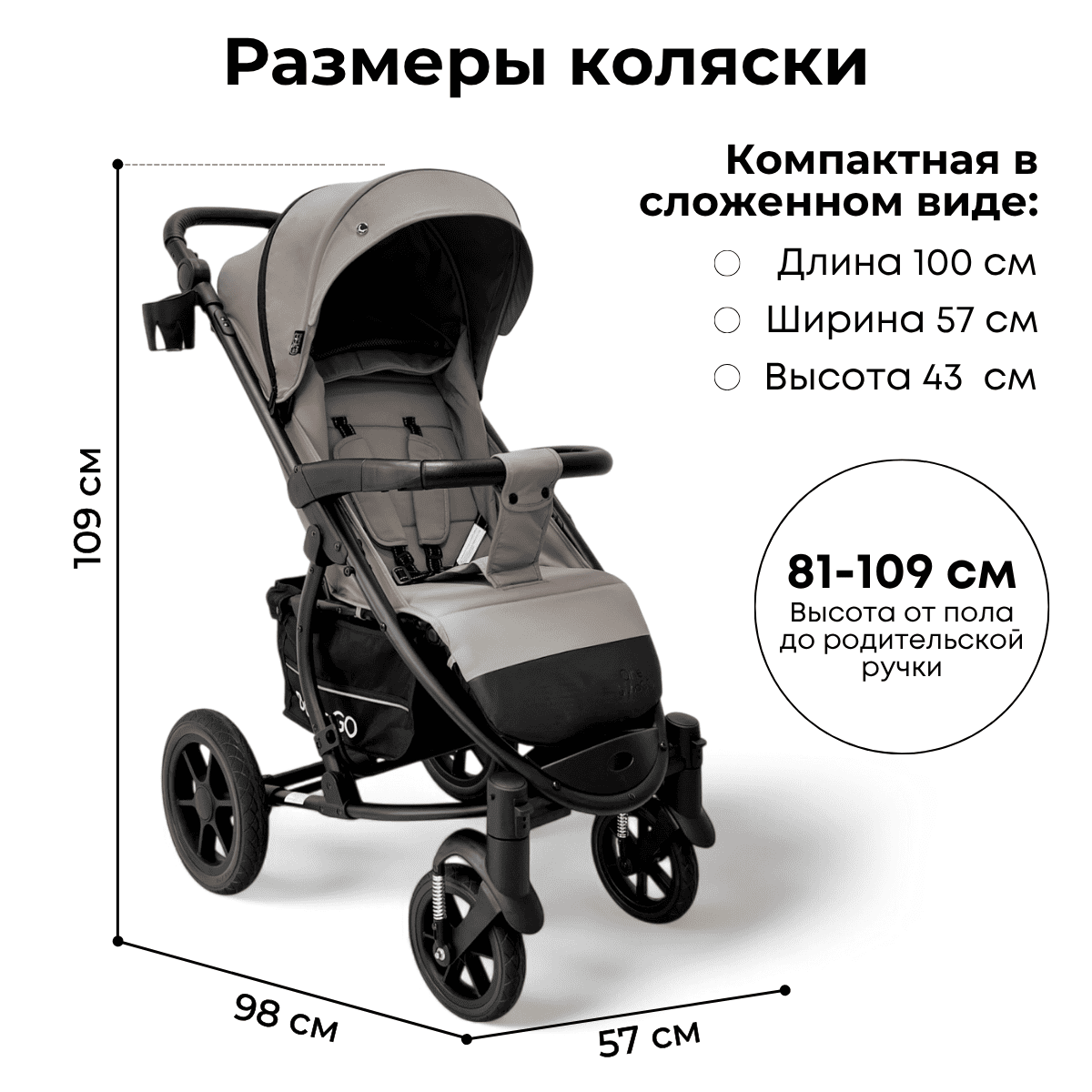 Регулируемая по высоте ручка 81–109 см с отделкой из эко-кожи, 10 фиксированных положений под рост мамы и папы.