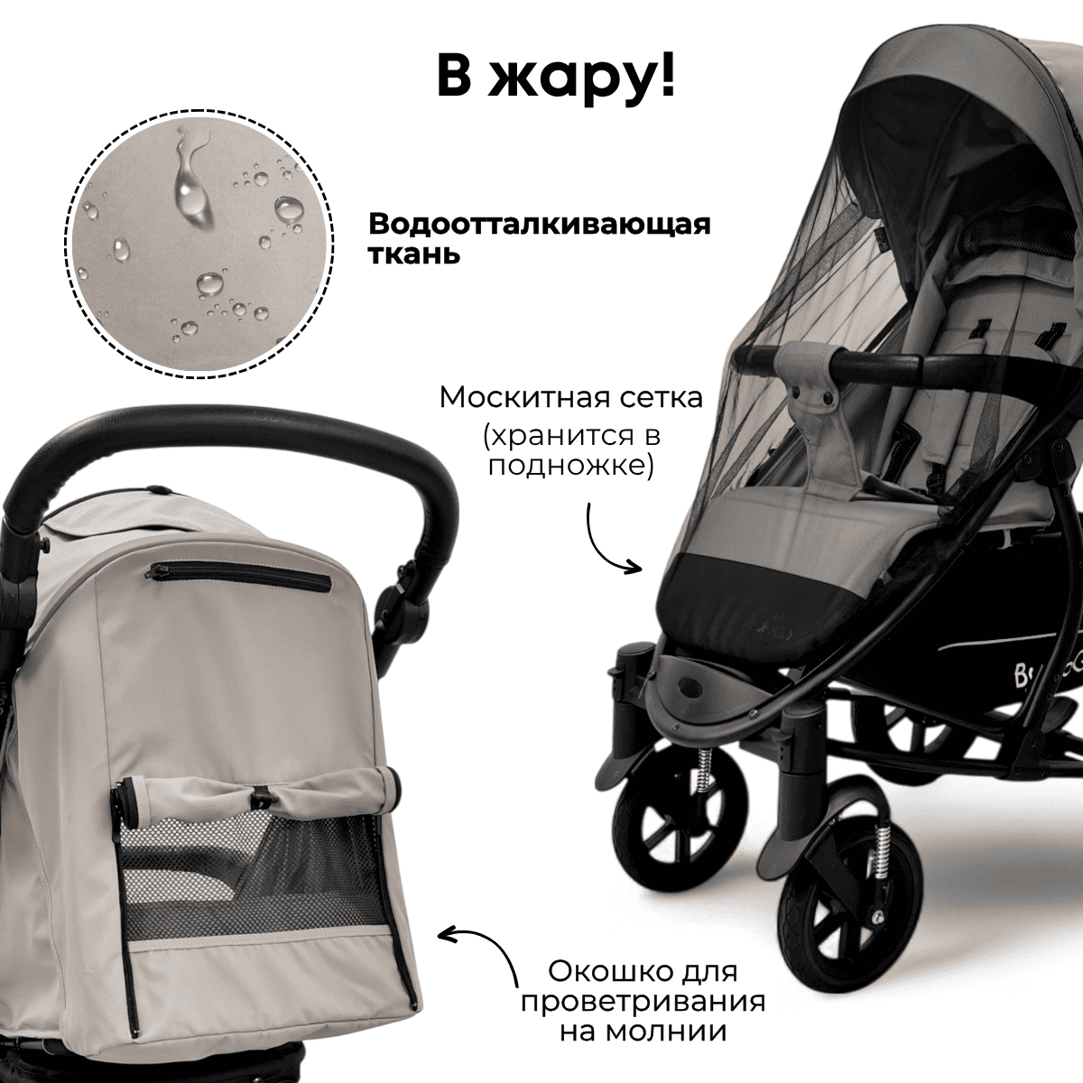 Обновлённая ткань 600D с водоотталкивающей пропиткой и защитой UV+50: не промокает, не парит и долго сохраняет презентабельный вид.